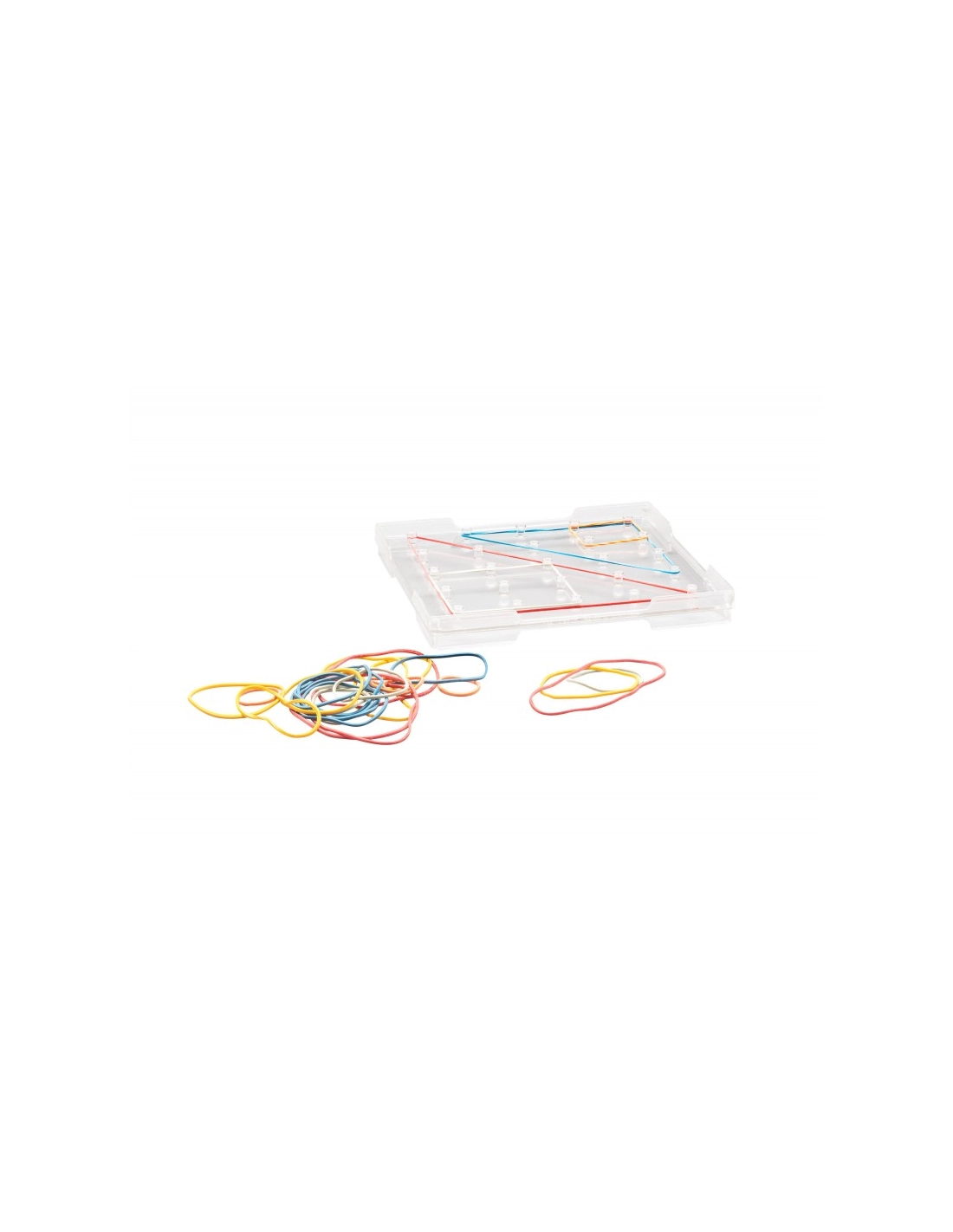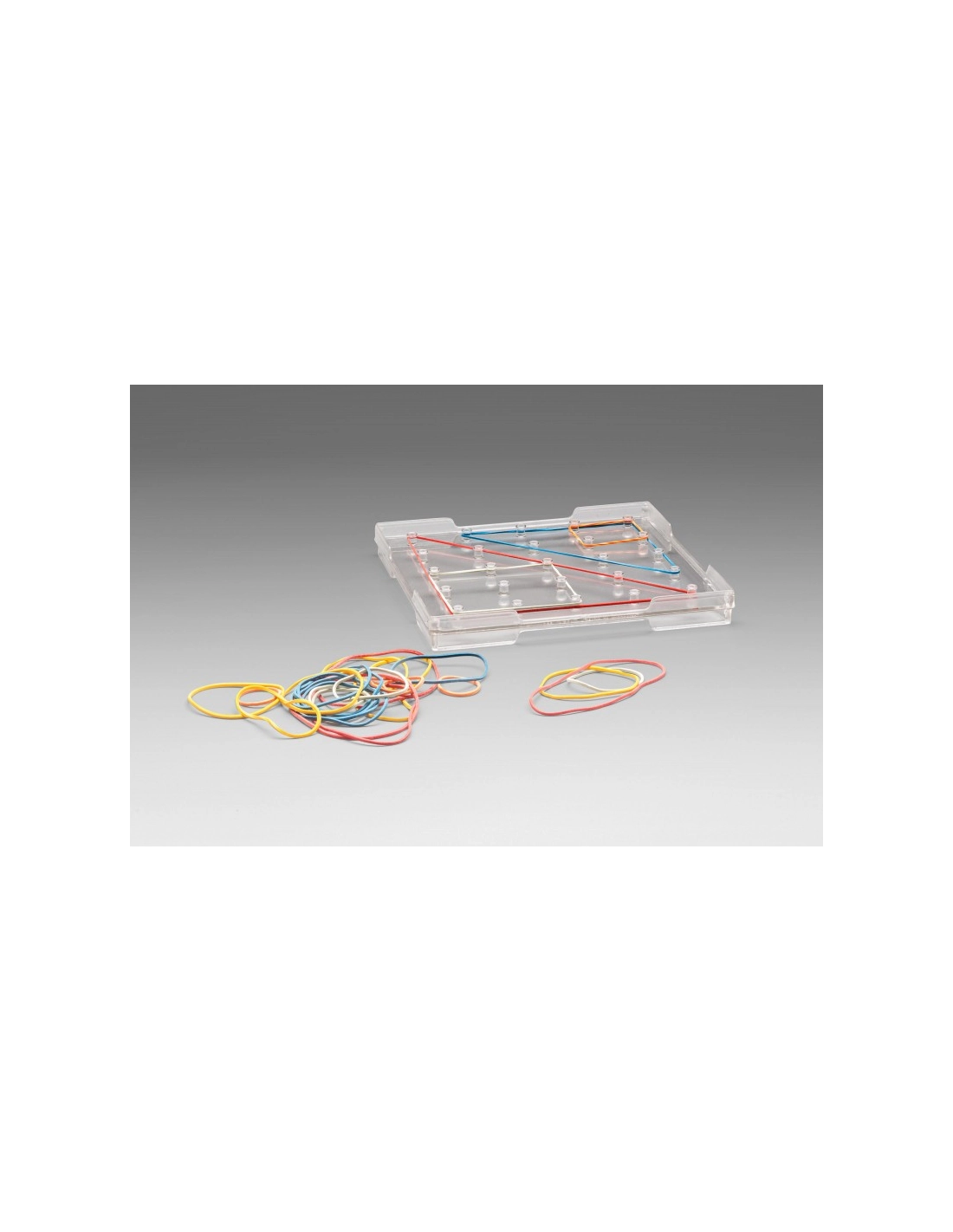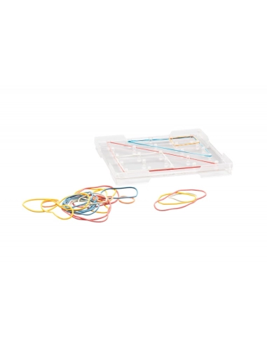 Ce géoplan (ou géoboard) se présente sous la forme d’une plaque transparente de 15 cm de côté, réalisée en matériau recyclé, et dotée de 25 plots disposés en une grille de 5 x 5. Il s’accompagne de 25 élastiques multicolores de différentes tailles, permettant de créer, reproduire et transformer toutes sortes de figures.
