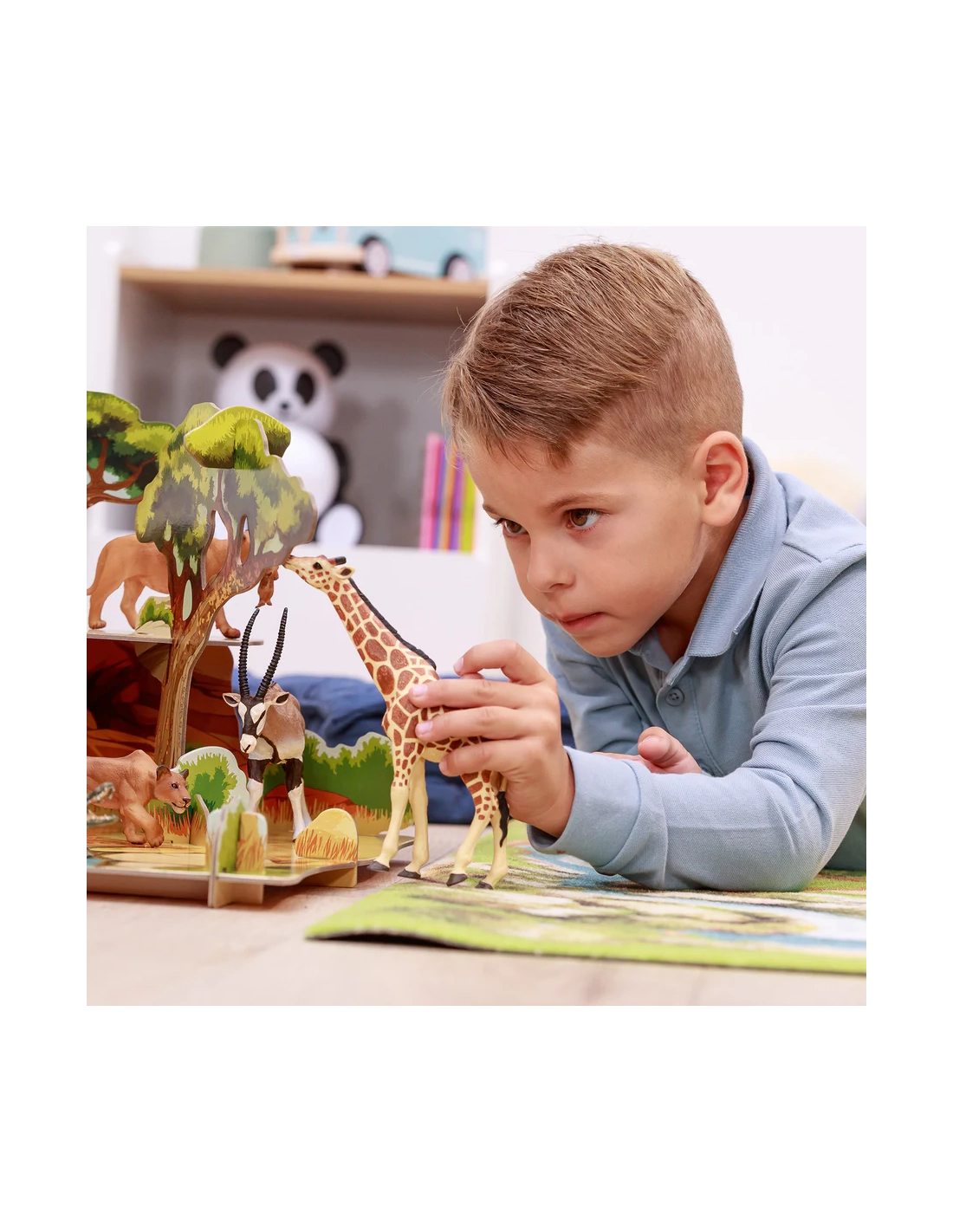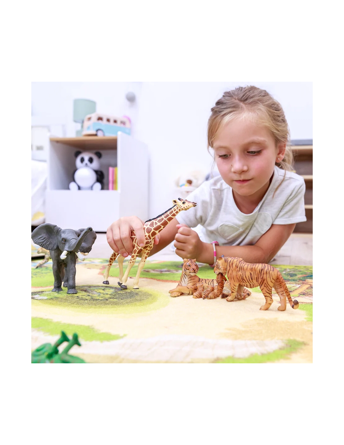Associée à l'éléphant, au lion, au zèbre et à l'oryx Papo, la girafe prend sa hauteur naturelle de point focal. Sa silhouette immédiatement reconnaissable et sa posture active en font le repère visuel autour duquel s'organise une scène de savane cohérente — que ce soit sur une étagère de collectionneur ou dans un bac de jeu.