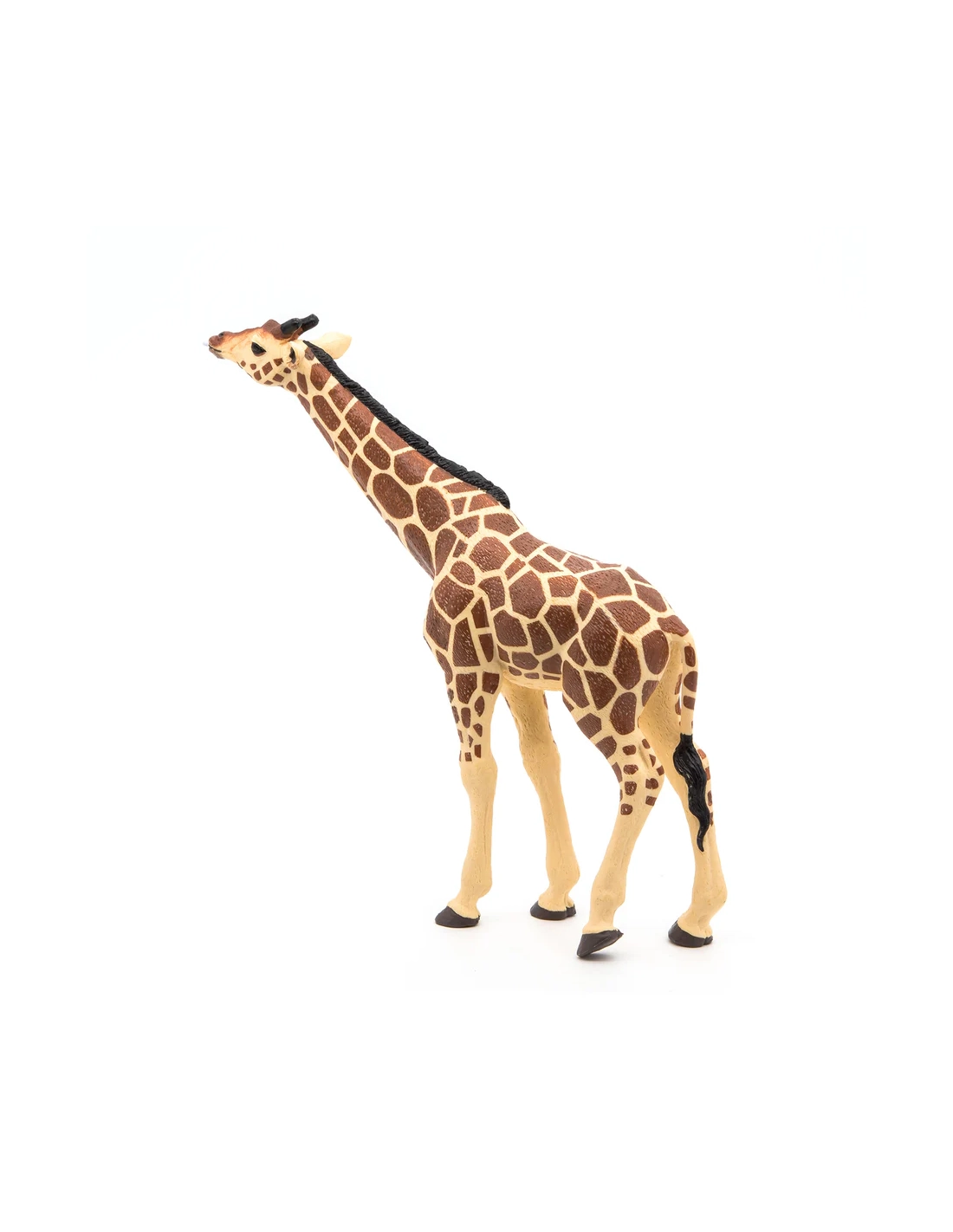 Tête vers le ciel, langue sortie en direction des feuilles d'acacia hors de portée de tous les autres herbivores — cette figurine Girafe tête levée Papo représente l'animal dans sa posture d'alimentation caractéristique, celle qui justifie littéralement l'existence de son cou. Le motif de plaques brun-roux aux contours nets sur fond crème est fidèle à la girafe réticulée, les sabots noirs et la crinière noire sont soigneusement peints à la main. Un jouet solide, une figurine de collection naturaliste, et une question ouverte sur l'évolution — tout à la fois.