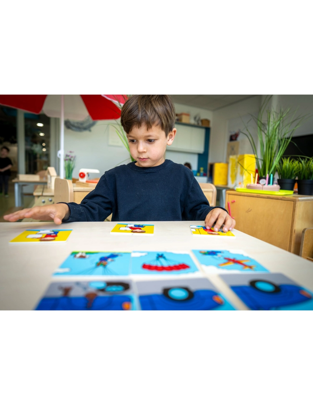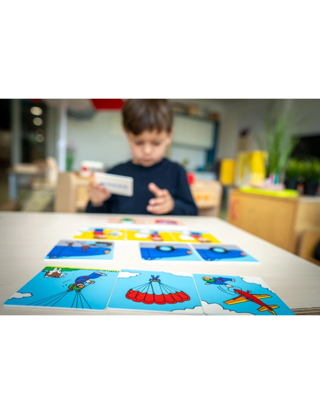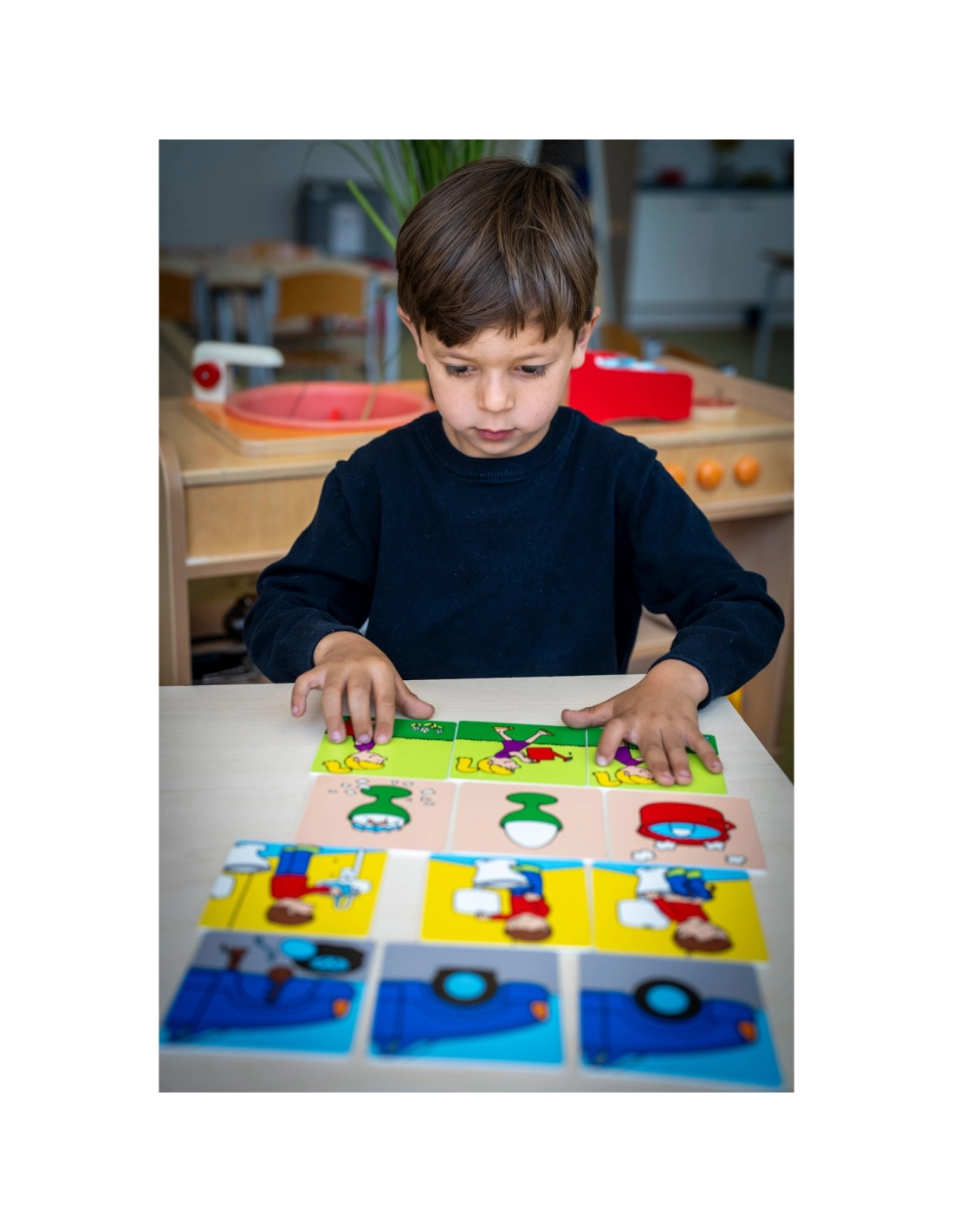 Ce jeu trouve facilement sa place dans un coin langage, un atelier éducatif ou une activité calme à la maison. Il aide l’enfant à comprendre qu’une histoire n’est pas seulement une suite d’images, mais un enchaînement logique d’événements. En jouant, il développe son vocabulaire, sa pensée chronologique et sa capacité à expliquer ce qu’il observe.