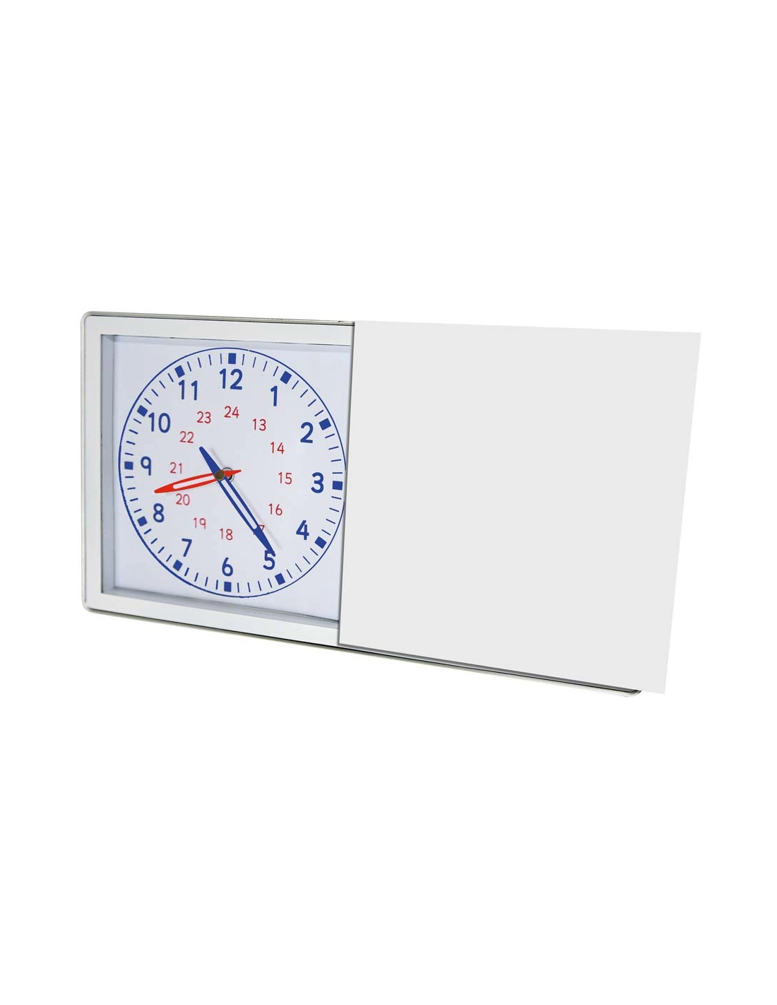 L'horloge dispose d'un cadran inversé qui fonctionne dans le sens des aiguilles d'une montre, facilitant la compréhension du temps qui passe. Le cache coulissant permet de masquer l'un des cadrans, transformant l'apprentissage en jeu interactif où l'enfant doit deviner l'heure avant de vérifier sa réponse.
