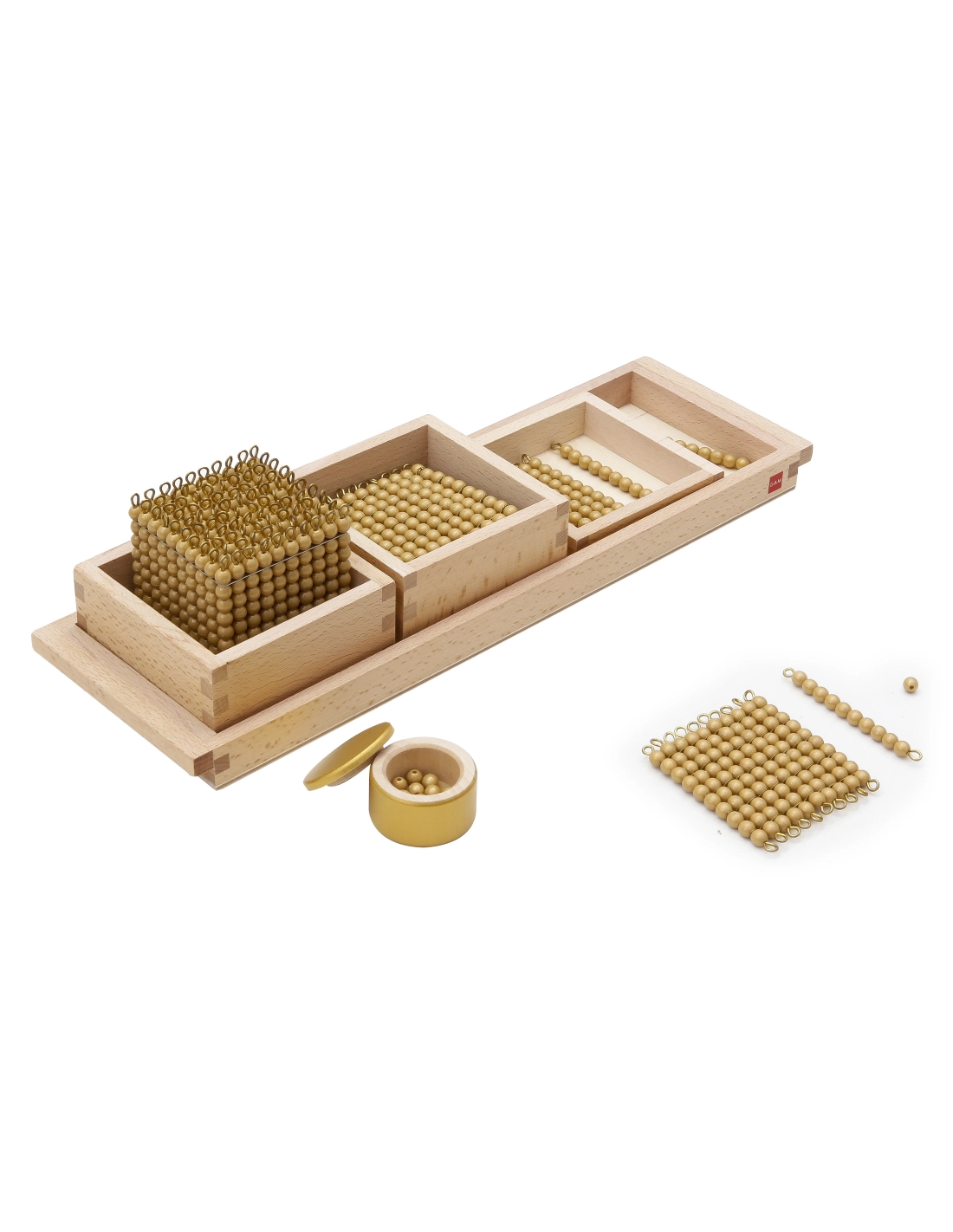 Une représentation concrète du système décimal 1 à 1000, qui démontre la valeur du lieu et le concept qu'une catégorie décimale ne peut pas dépasser 9.L'ensemble comprend: 9 perles unitaires individuelles, 9 bars de 10, 9 carrés de 100, 1 cube de 1000, 3 boîtes en bois, 1 plateau d'unité en bois et un plateau en bois.