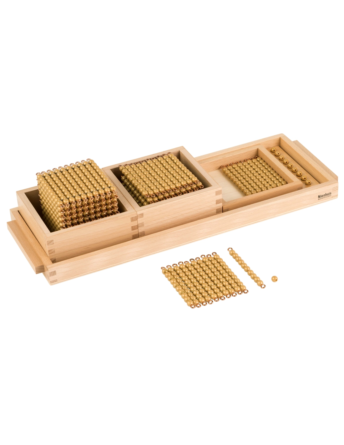 Découvrez le Carré de 100 en Perles Dorées Connectées, un matériel éducatif essentiel pour l'apprentissage des concepts mathématiques de base selon la méthode Montessori. Ce carré de 100 perles dorées connectées est spécialement conçu pour aider les enfants à comprendre le système décimal et la valeur de position des nombres.