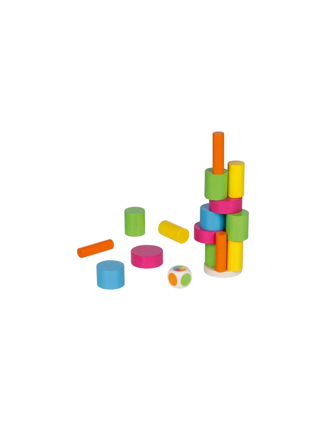Dé spécial avec faces colorées correspondant aux couleurs des éléments à empiler, plus une face multicolore