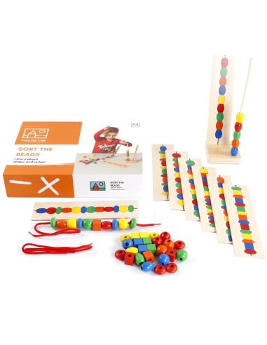 Le jeu éducatif "Sort the Beads" permet de travailler plusieurs domaines d'apprentissages tels que la coordination œil-main, la logique mathématique, la concentration et la dextérité. Les enfants peuvent apprendre les couleurs, les formes, les ordres et les motifs grâce aux cartes en bois recto-verso présentant 16 modèles différents à reproduire, ainsi qu'avec les 40 perles en bois de différentes couleurs et formes pour créer librement de nouvelles combinaisons. Ce matériel pédagogique de qualité et durable convient parfaitement pour une utilisation intensive à l'école, à la crèche ou à la maison.