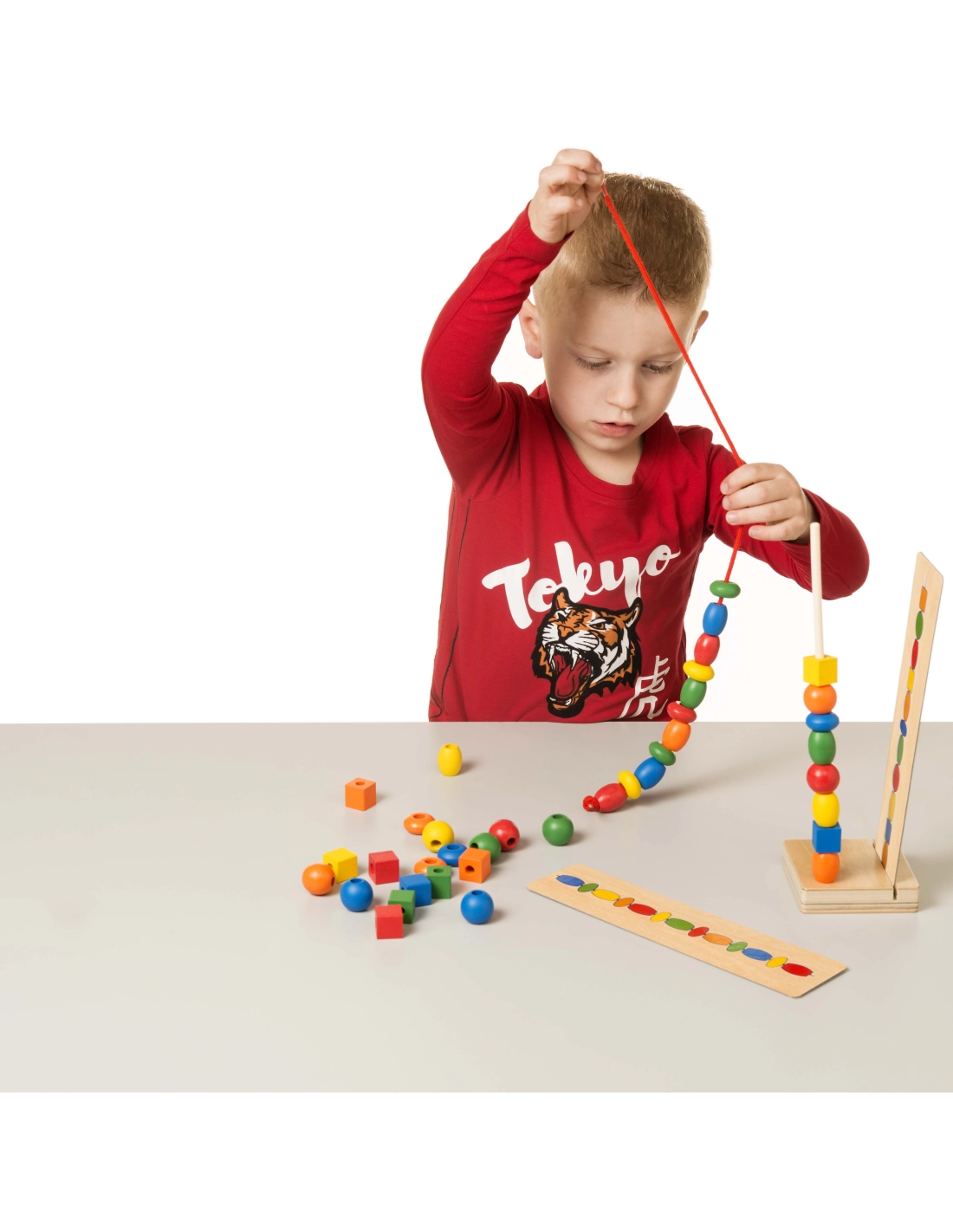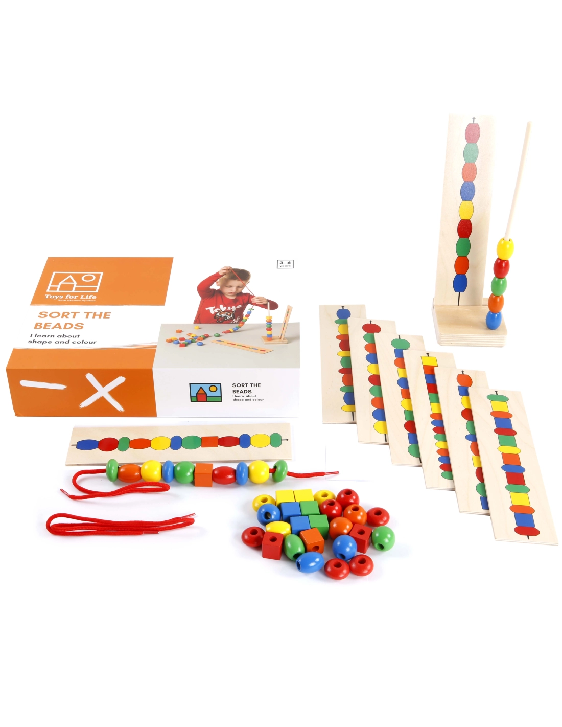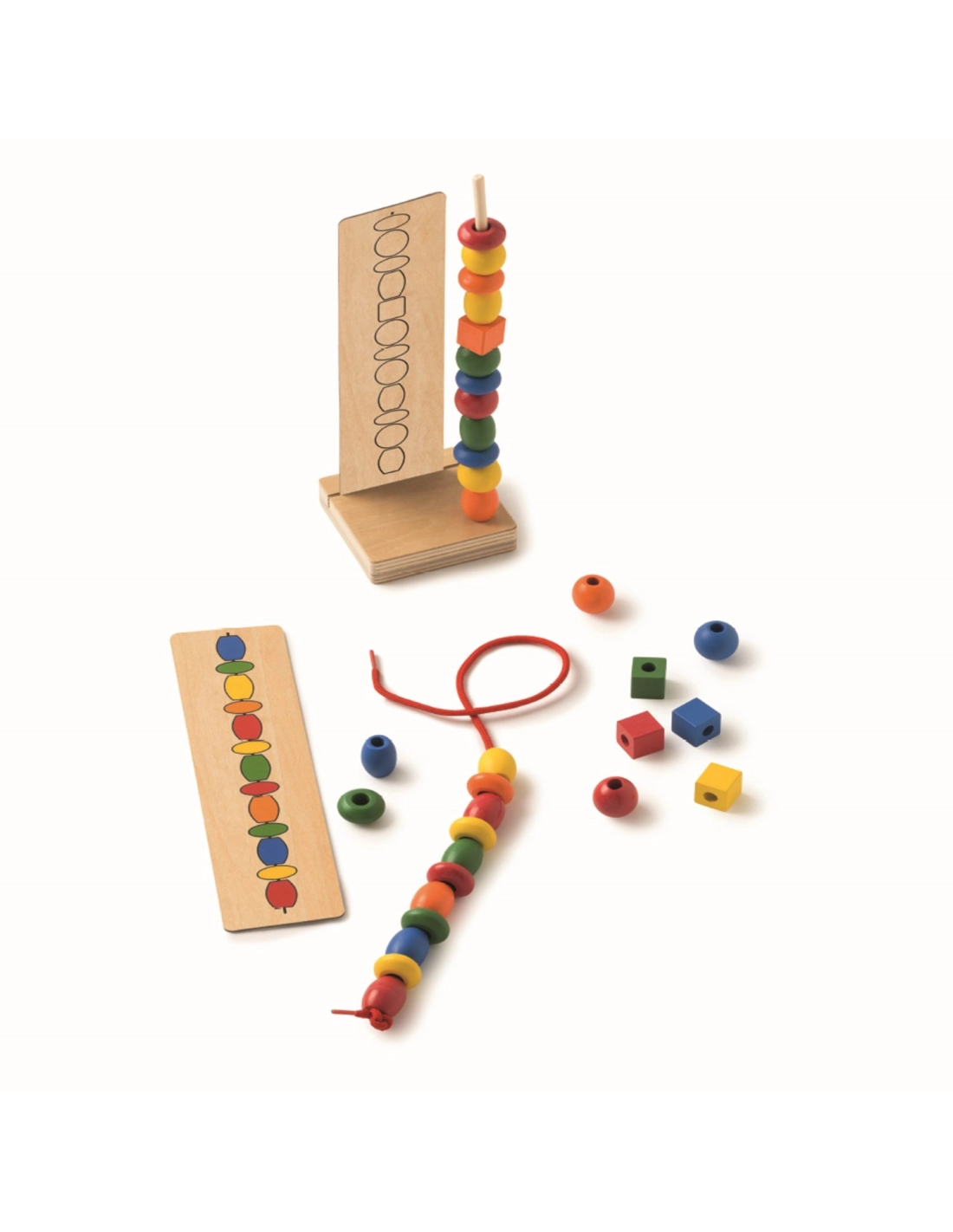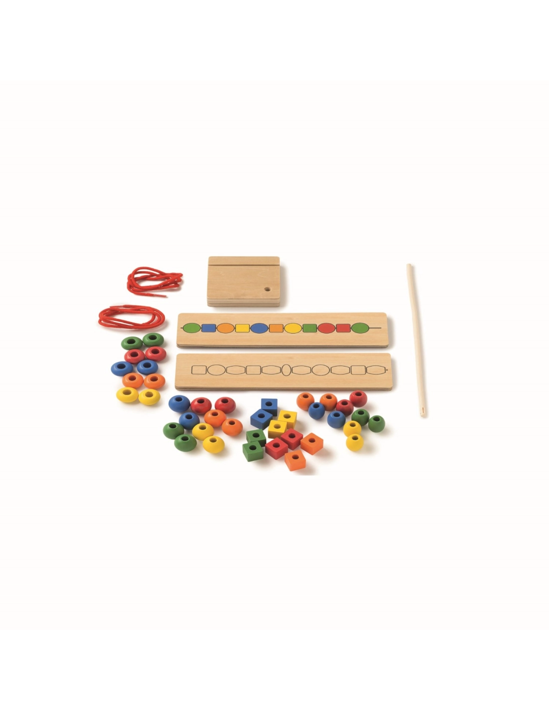 - Boîte contenant : 8 cartes en bois recto-verso, 2 lacets, 40 perles en plastique de 5 couleurs et 4 formes différentes, 1 base en bois et 1 tige en plastique