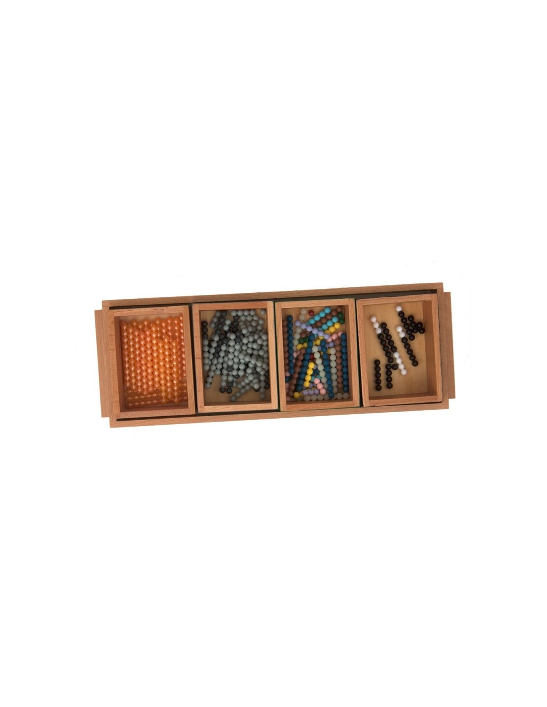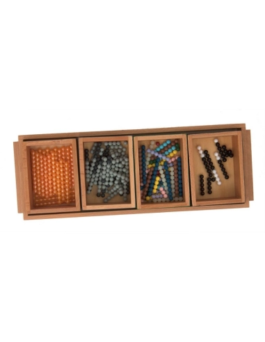 - Ce matériel Montessori qui permet d’illustrer les opérations de soustraction, y compris avec des nombres supérieurs à 10. Il se compose d’un plateau, de quatre boîtes contenant des perles de différentes couleurs, de deux cavaliers et d’une perle noire et blanche.