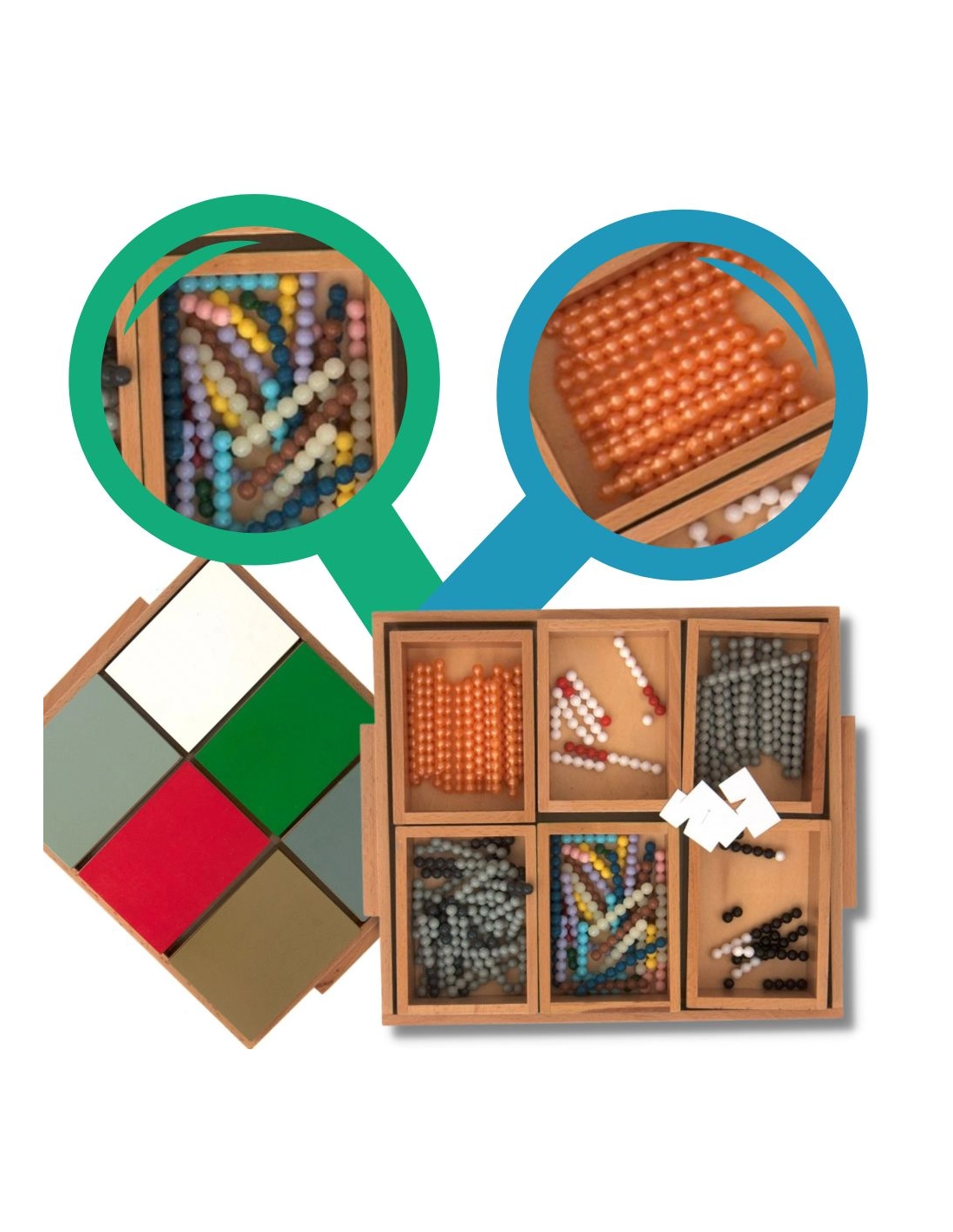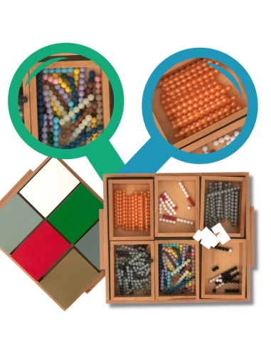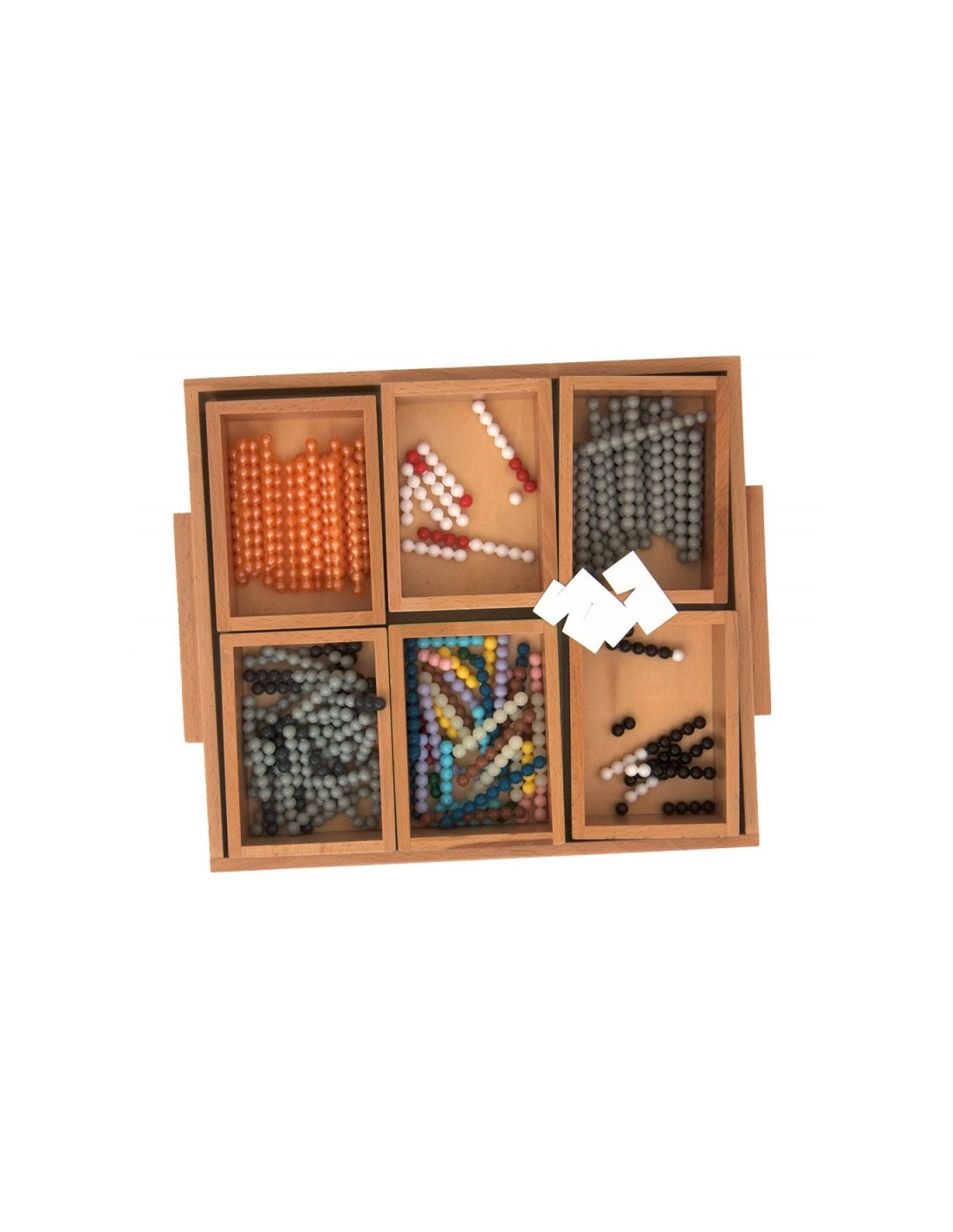 Le plateau compartimenté en bois permet un rangement et un transport faciles des diverses chaînes de perles et des barres représentant les dizaines. Tout est à portée de main pour enchaîner les opérations.