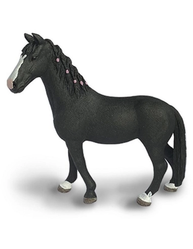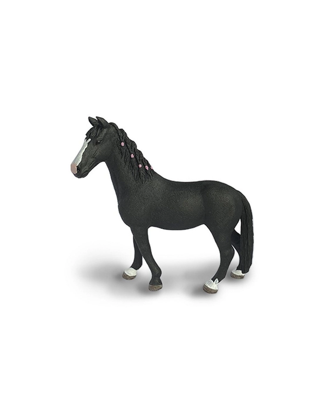 La jument est représentée avec une crinière tressée, ajoutant une touche de réalisme et de soin du détail. La robe noire, minutieusement peinte à la main, montre une teinte uniforme et riche, reflétant fidèlement les caractéristiques de la race.