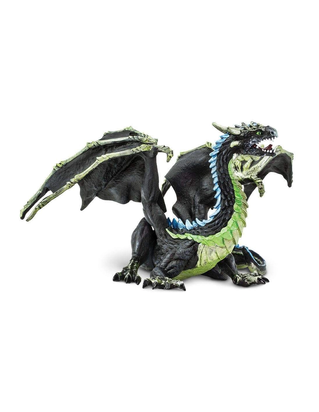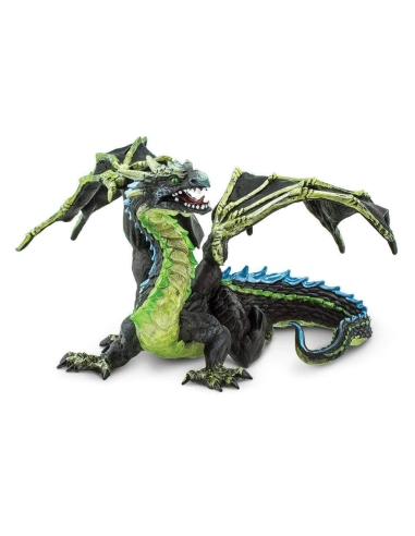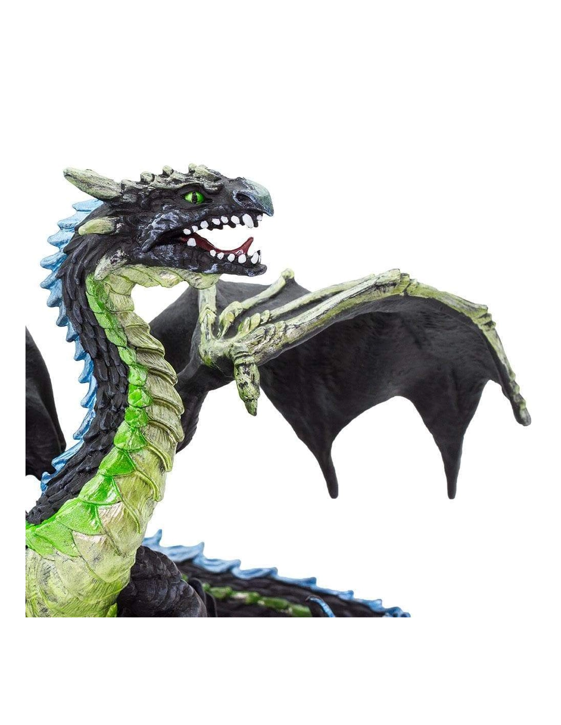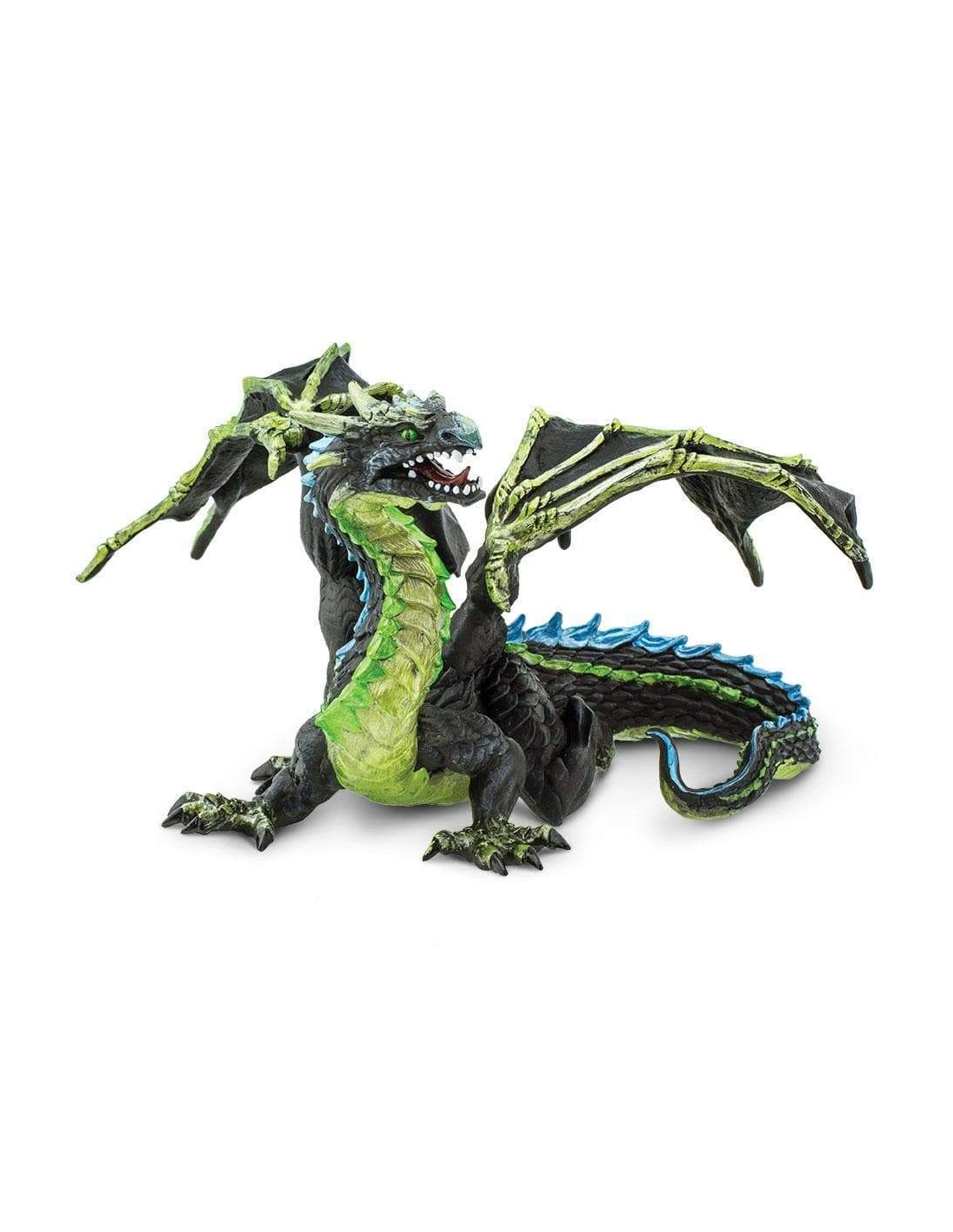 Kaelthar ne rugit pas. Il n'annonce pas son arrivée. Il se fond dans l'air humide, glisse entre les arbres, ses ailes aux ossements apparents réduites au silence par la brume qui l'enveloppe. Corps noir comme le fond d'une forêt sans lune, écailles vert fumée luisant d'un éclat presque végétal, épines bleues coupantes comme le gel : cette figurine Safari Ltd capture un dragon d'une dangerosité silencieuse, d'autant plus fascinant qu'il ne cherche pas à intimider. Il attend, simplement. Et il est déjà là.