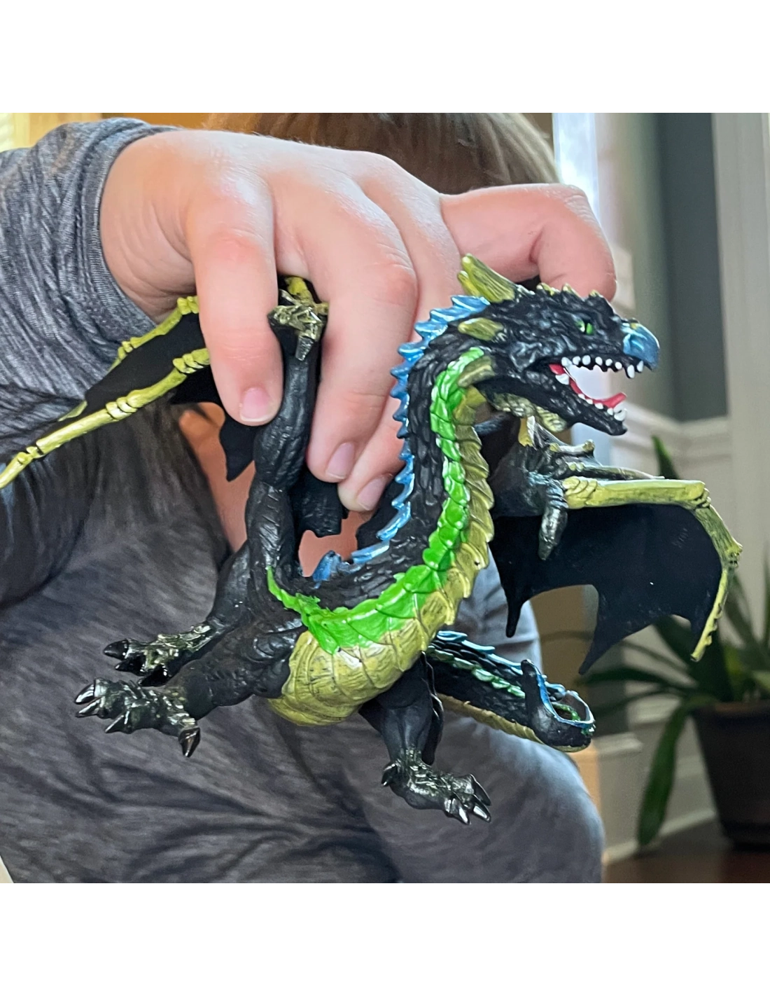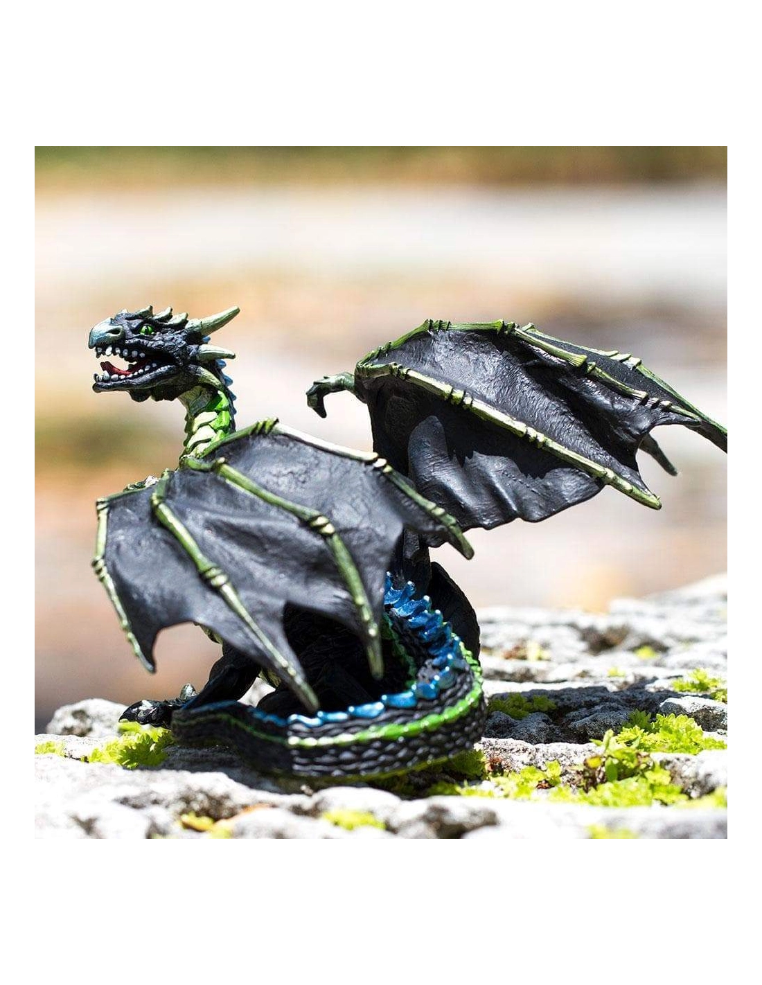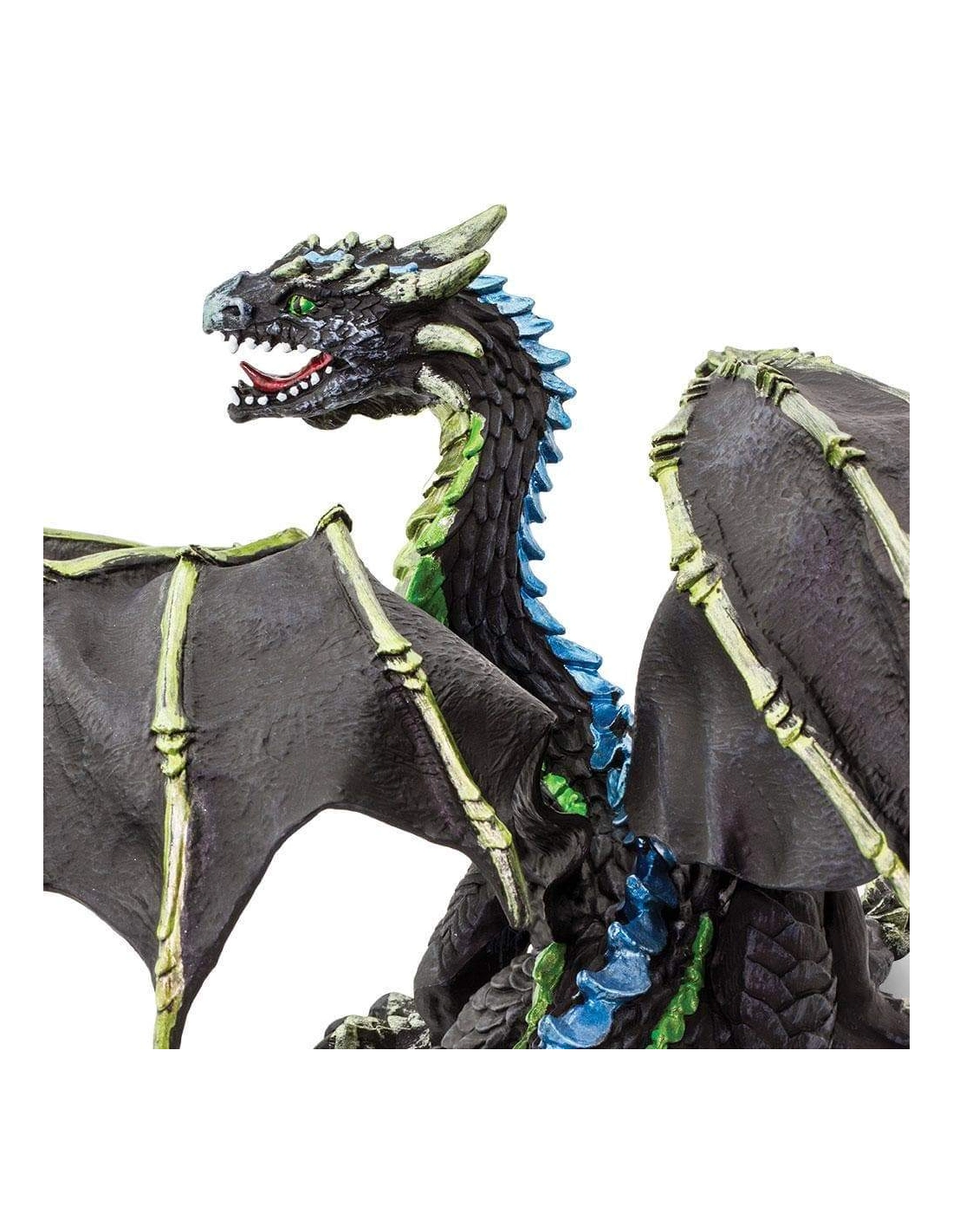 Kaelthar ne rugit pas. Il n'annonce pas son arrivée. Il se fond dans l'air humide, glisse entre les arbres, ses ailes aux ossements apparents réduites au silence par la brume qui l'enveloppe. Corps noir comme le fond d'une forêt sans lune, écailles vert fumée luisant d'un éclat presque végétal, épines bleues coupantes comme le gel : cette figurine Safari Ltd capture un dragon d'une dangerosité silencieuse, d'autant plus fascinant qu'il ne cherche pas à intimider. Il attend, simplement. Et il est déjà là.