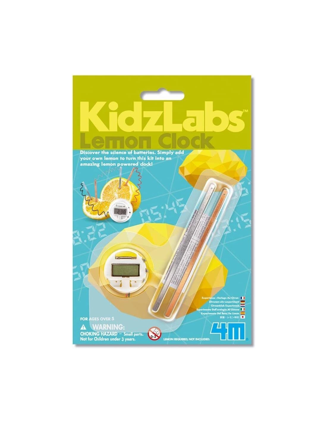 Le Kit Horloge Citron 4M KidzLabs est une expérience scientifique ludique qui permet aux enfants de découvrir les principes de l'électricité en créant leur propre horloge alimentée par un citron.