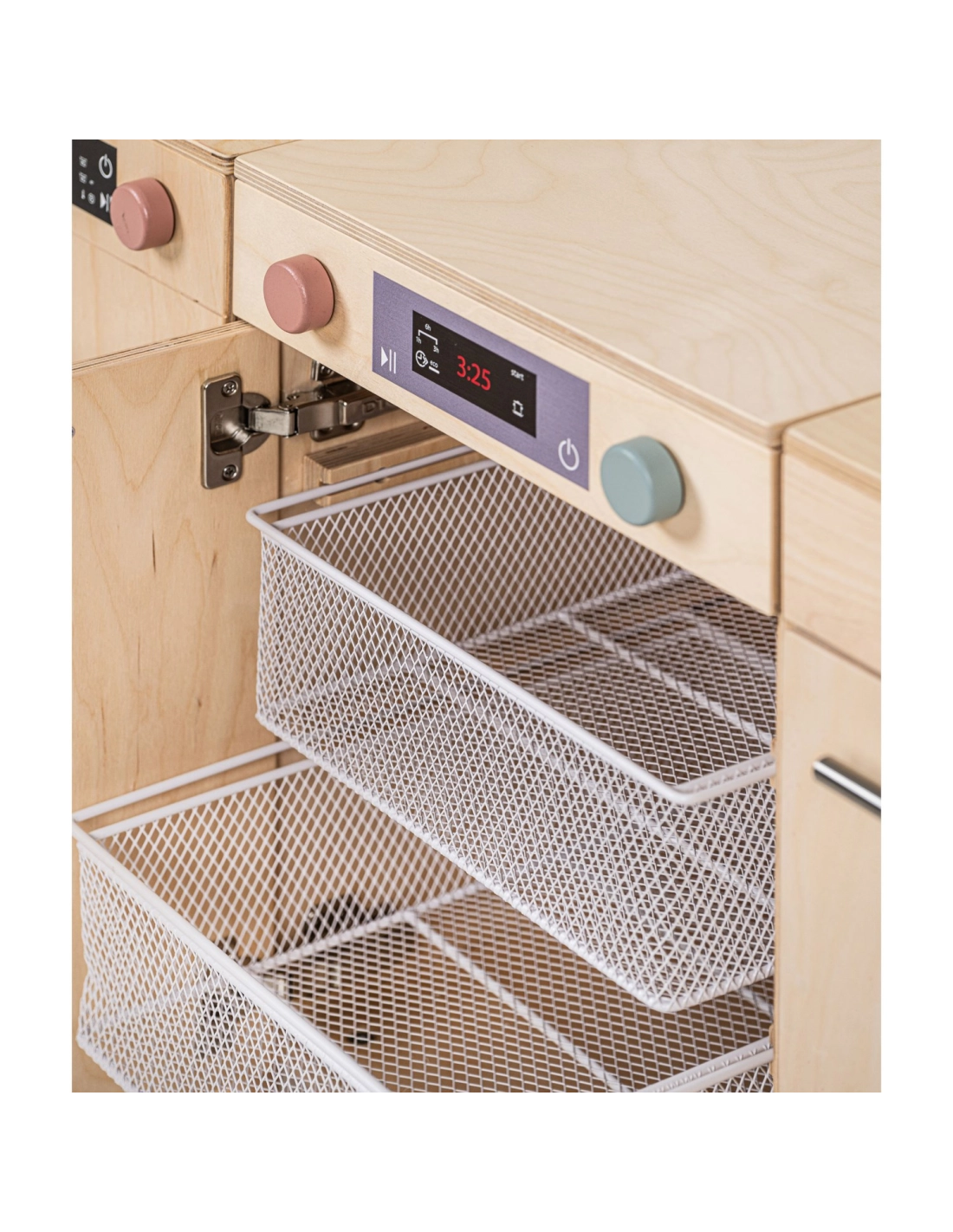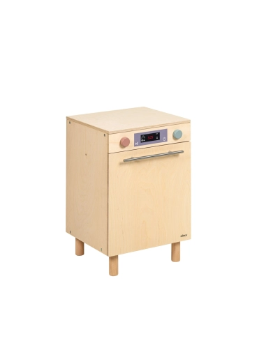 Ce lave-vaisselle en bois apporte une touche de modernité et de fun dans le coin cuisine de vos enfants. Son affichage “digital”, ses boutons qui émettent un “tic” en tournant et sa poignée métallique en font un jouet d’imitation réaliste, idéal pour développer la motricité fine, la coopération et la communication dès le plus jeune âge.