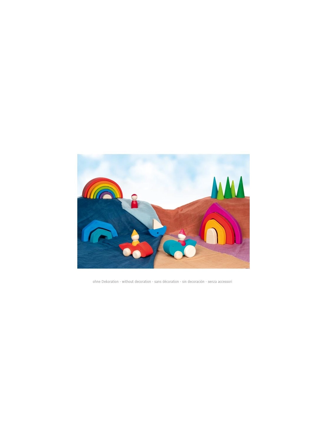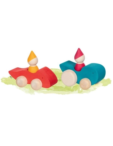 Avec leurs couleurs complémentaires rouge et bleu turquoise, ces voitures font partie de ces jouets ouverts qui laissent libre cours à l'imagination. Pas de boutons, pas de sons, juste du bois de qualité qui invite au jeu libre.