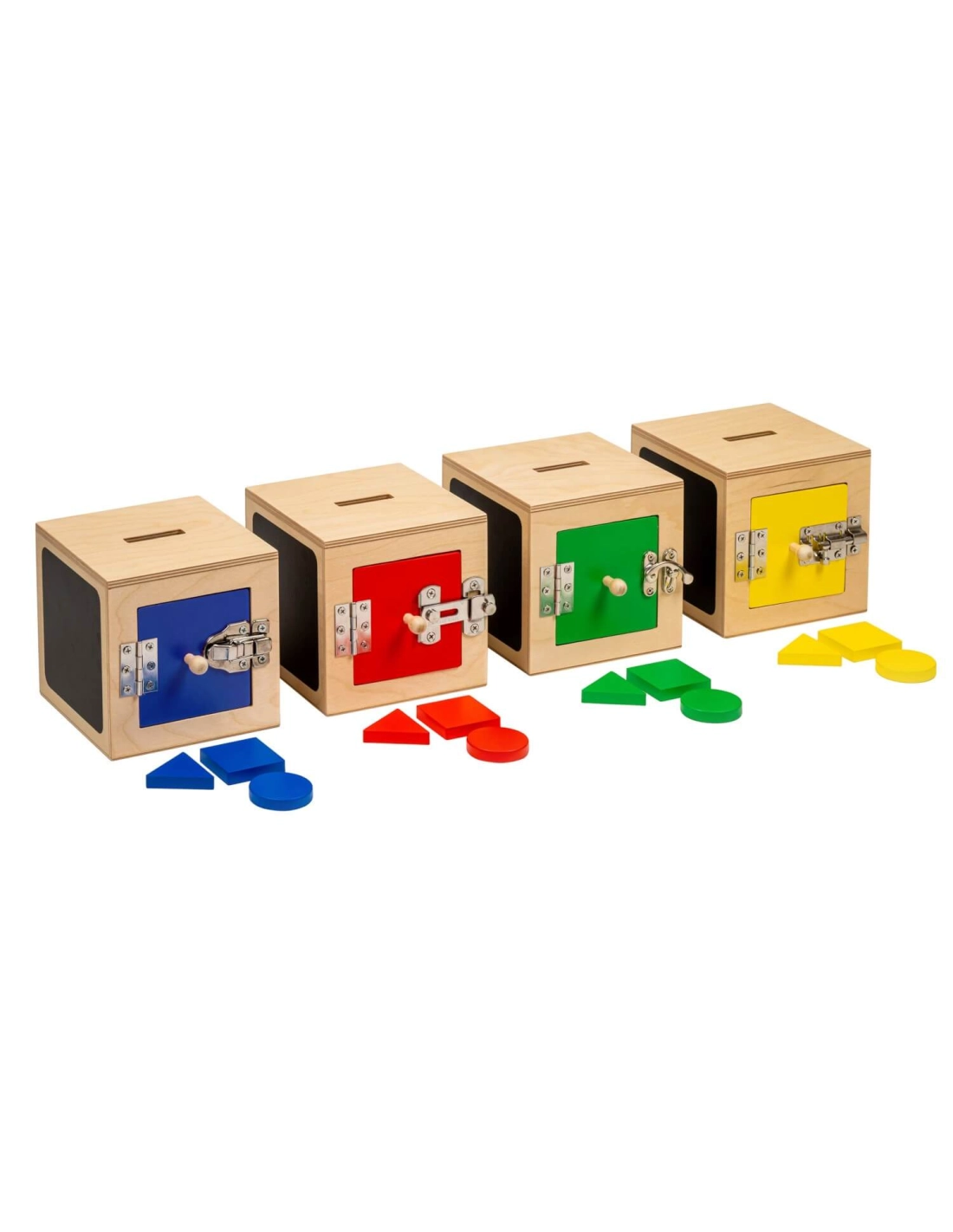 Les boîtes comprennent chacune 3 formes géométriques à insérer (triangle, carré et cercle) assorties à la couleur de la porte. Ce jeu simple et amusant permet d'apprendre à reconnaître les formes et à associer les couleurs facilement.