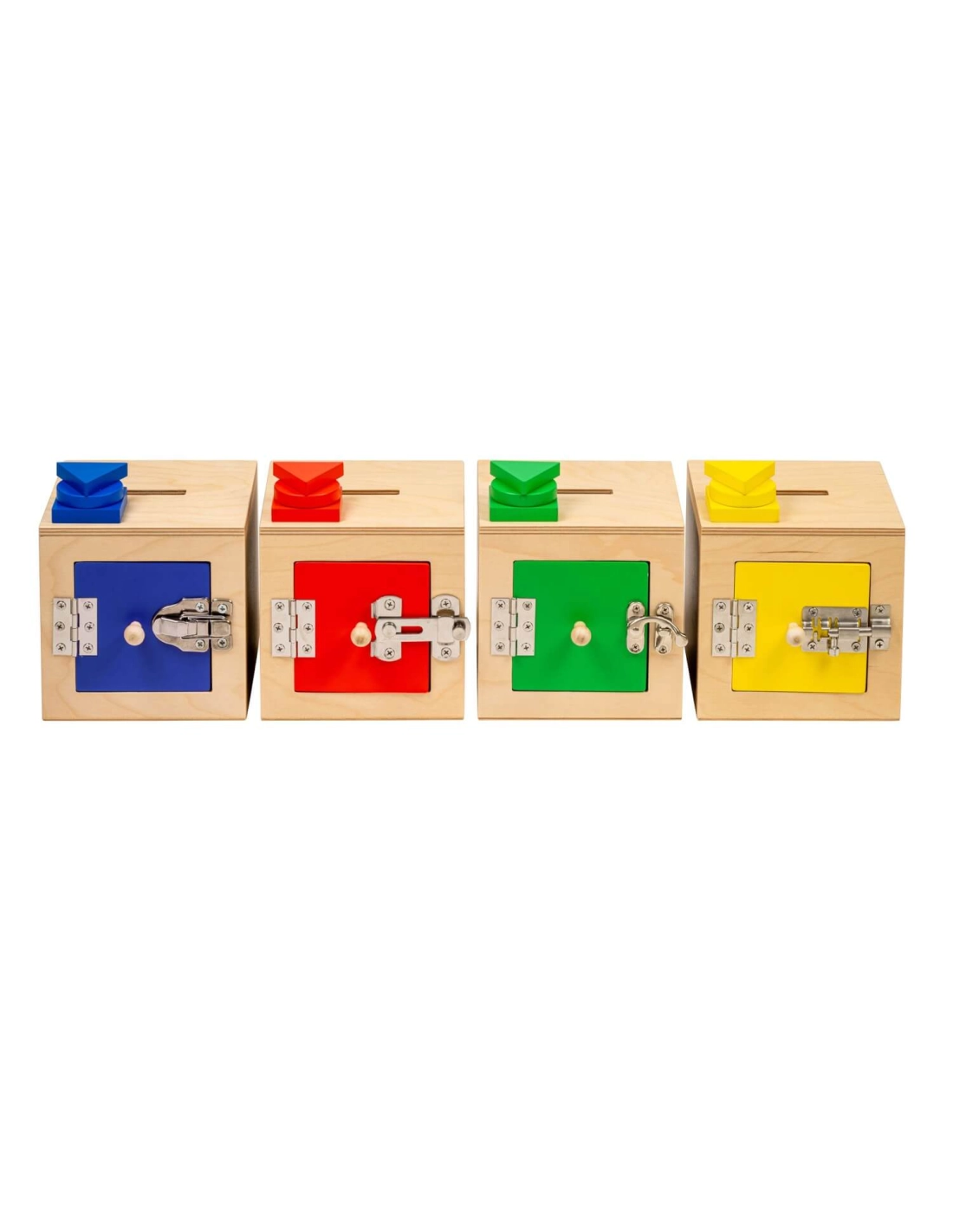 Ce lot de 4 boîtes éducatives Educo permet aux enfants dès 2 ans d'apprendre à ouvrir différents types de loquets : loquet à crochet, verrou pivotant, fermoir métallique et loquet classique. Ces manipulations développent la motricité fine, l'autonomie et la précision du geste chez les tout-petits.
