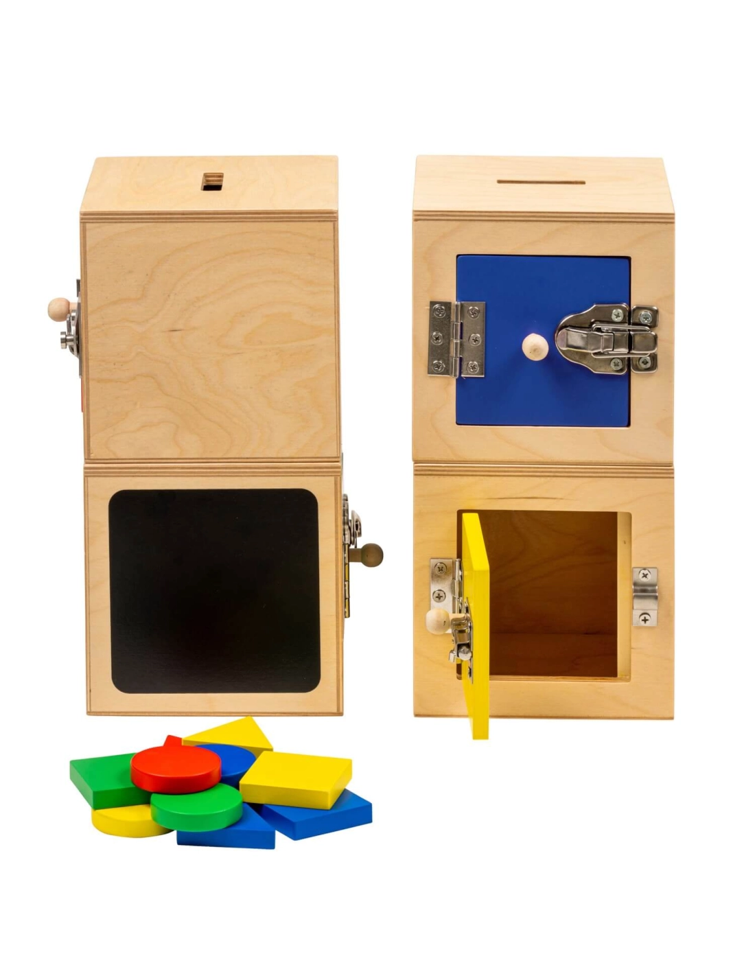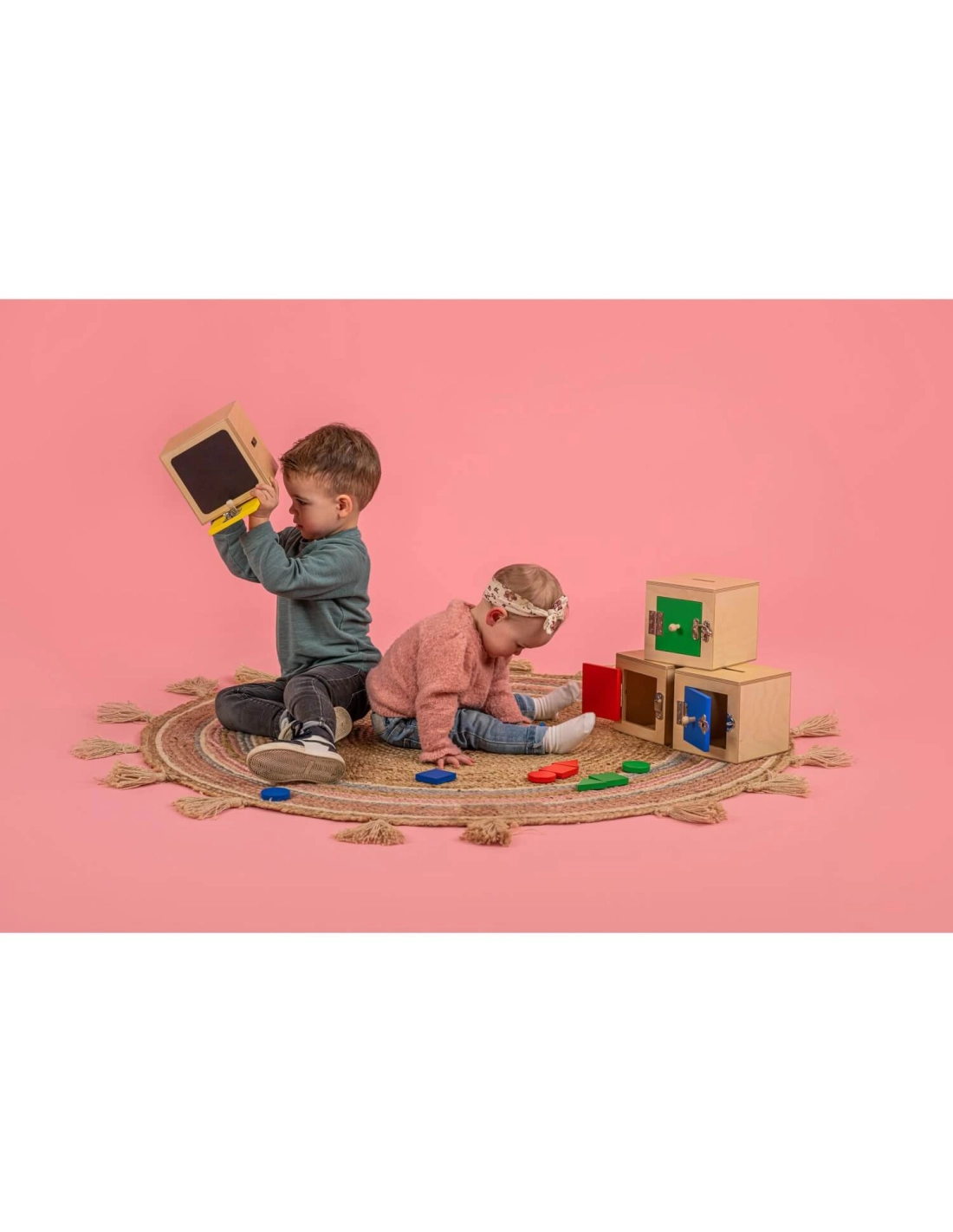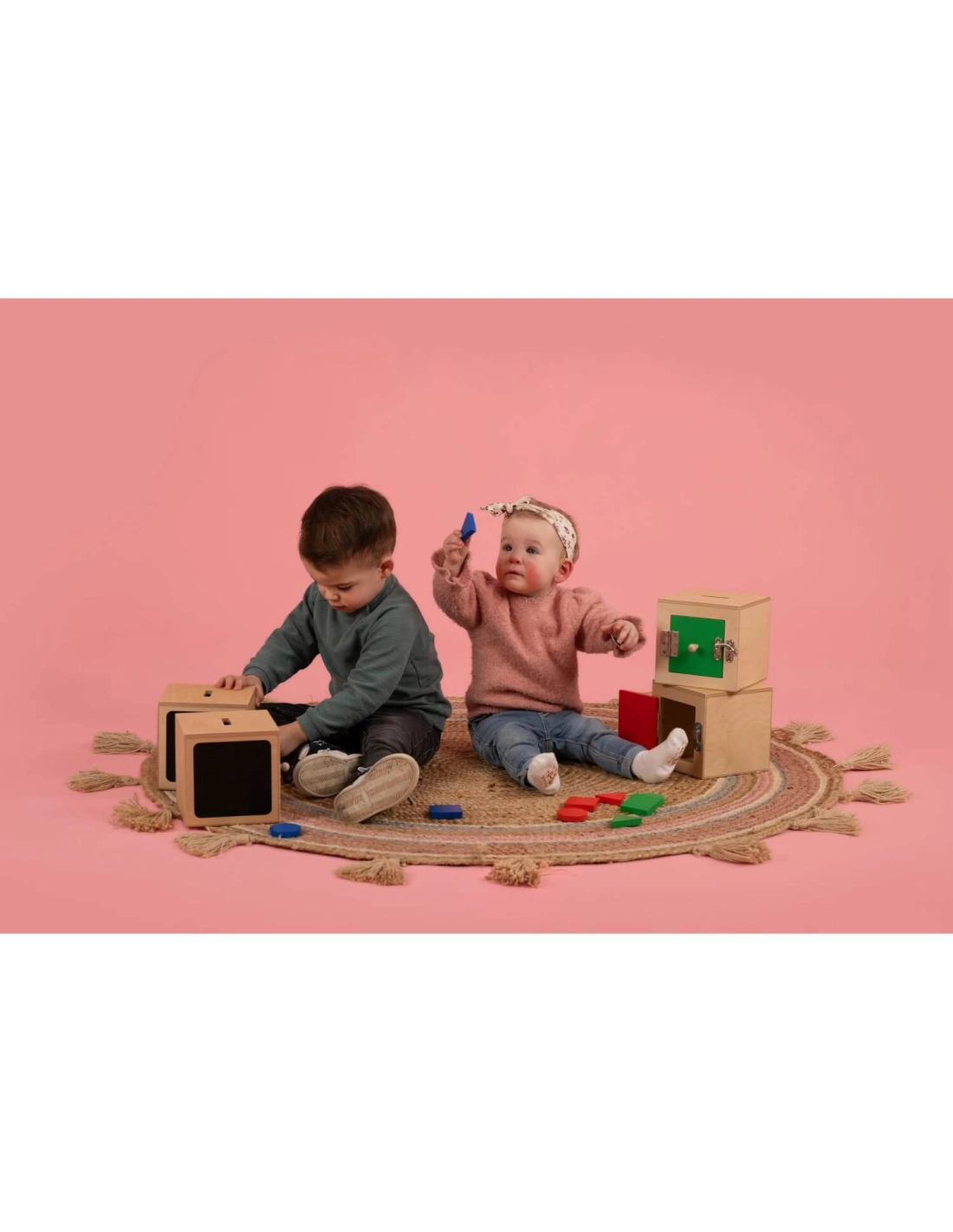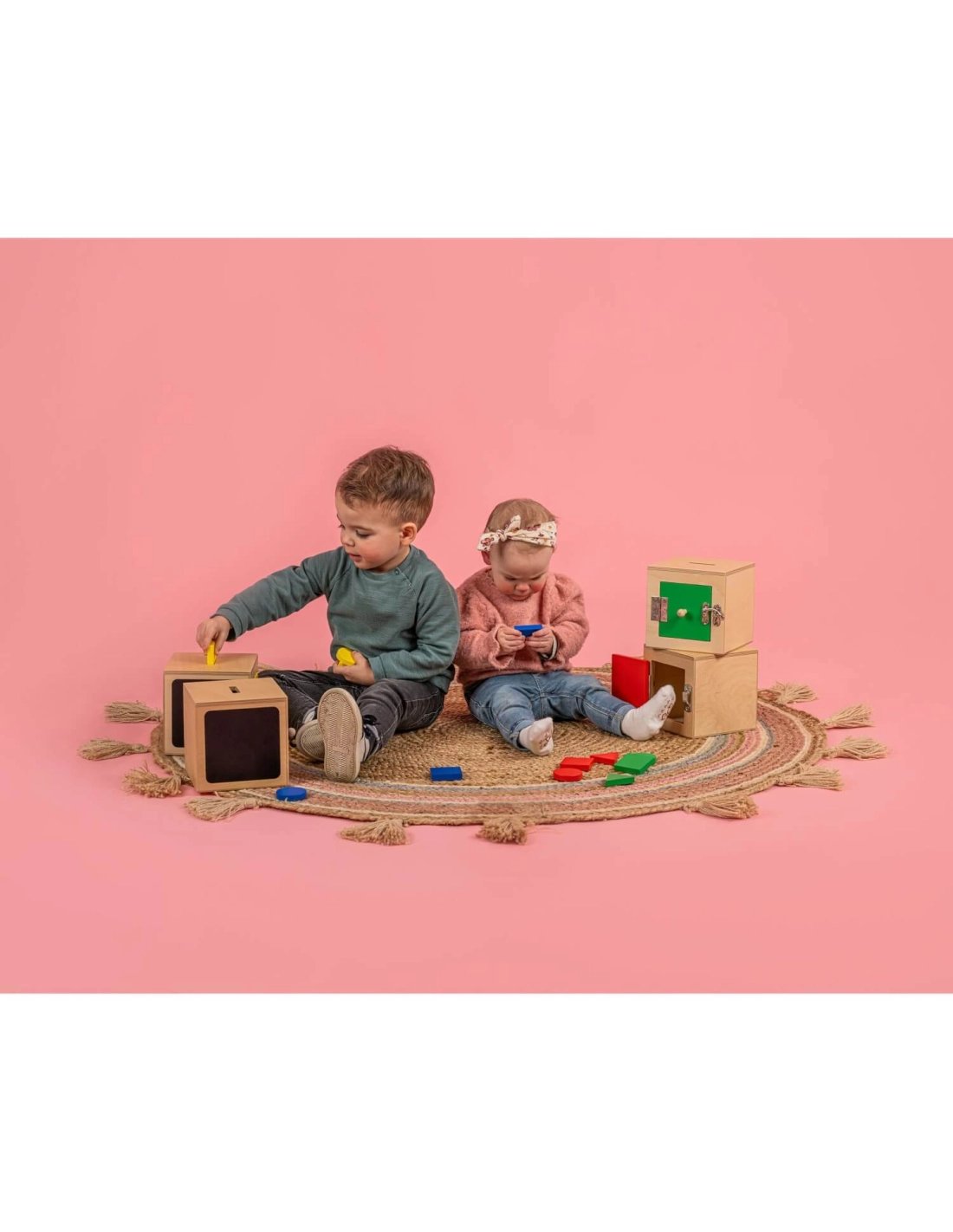 Fabriquées en bois naturel robuste avec des loquets métalliques solidement fixés, ces boîtes sont conçues pour une utilisation durable, sûre et intensive, aussi bien à la maison qu’en collectivité (crèche, maternelle, ateliers Montessori).