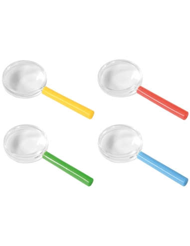 Il s'agit d'un lot de 4 loupes de couleurs assorties, mesurant environ 10cm de long avec un diamètre de 4,2 cm et un manche en PVC de 4 couleurs différentes (rouge, jaune, vert et bleu).