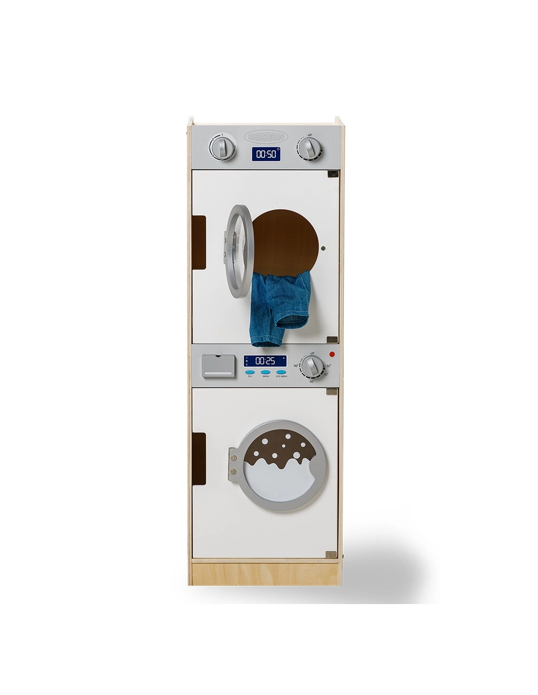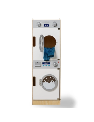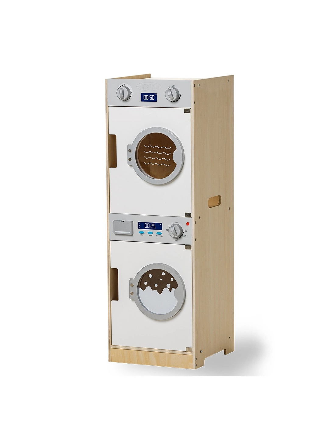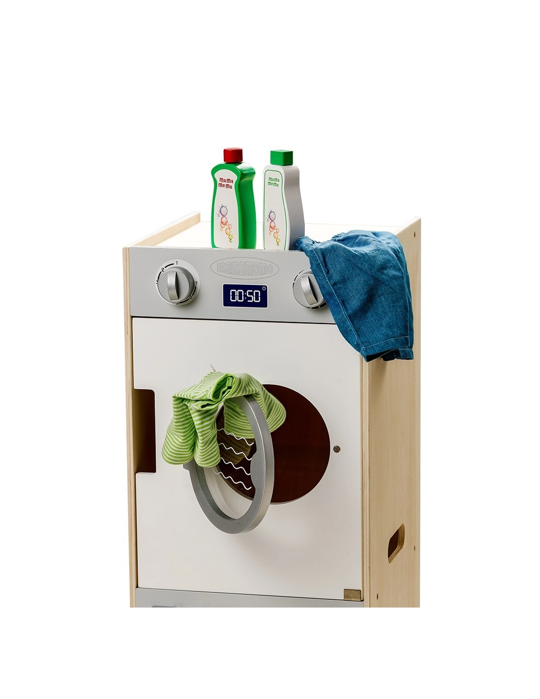 La machine en bois a un hublot avec des effets de mousse, le bac pour la lessive s'ouvre pour mettre celle-ci dedans. Les boutons tournent.