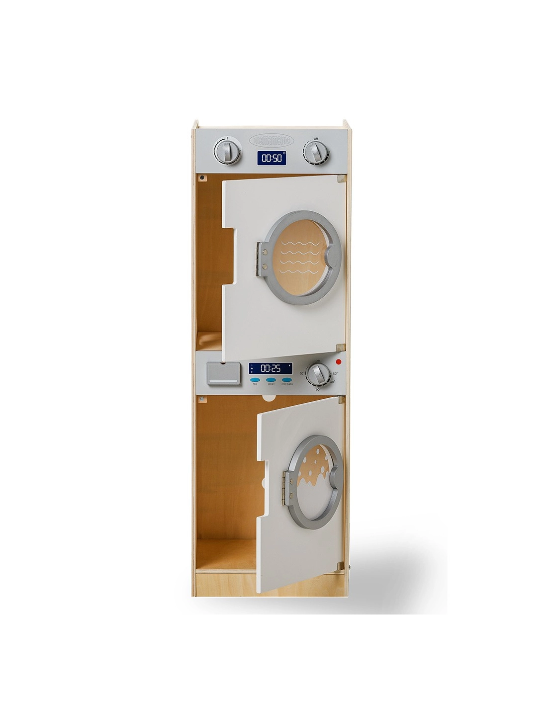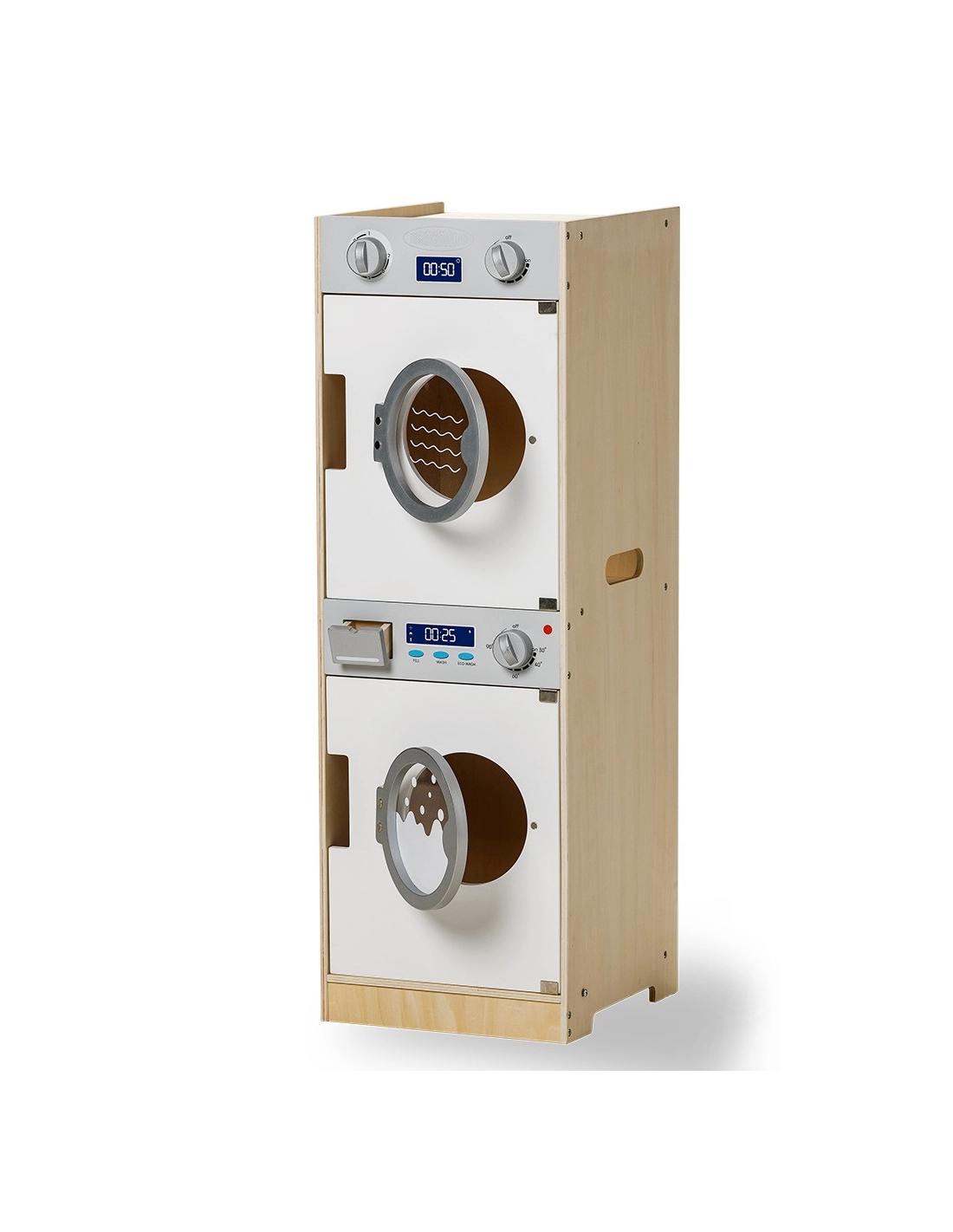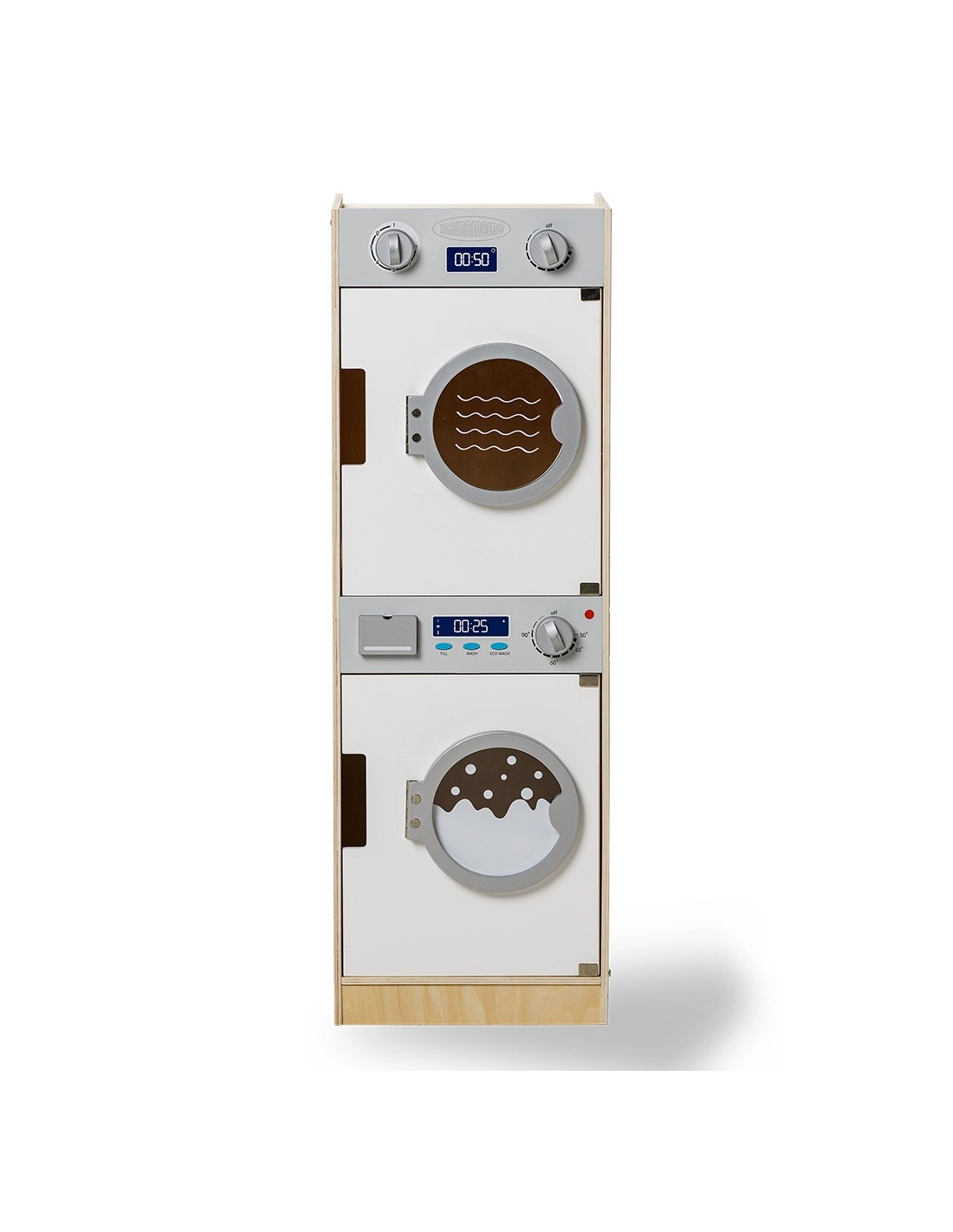 La machine en bois a un hublot avec des effets de mousse, le bac pour la lessive s'ouvre pour mettre celle-ci dedans. Les boutons tournent.