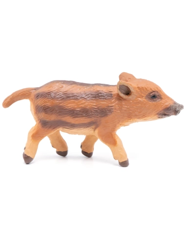 Rayures longitudinales brun clair et brun foncé sur fond beige-roux — la livrée unique du jeune sanglier qui ne durera que ses premiers mois de vie — silhouette ronde et compacte, petit groin bien dessiné, oreilles dressées : la figurine Marcassin Papo (Sus scrofa) est une représentation précise du jeune sauvage dans ses premières semaines de vie. Peinte à la main, L 5,5 cm. Petite figurine d'une précision et d'une tendresse rares dans la gamme animaux forestiers.