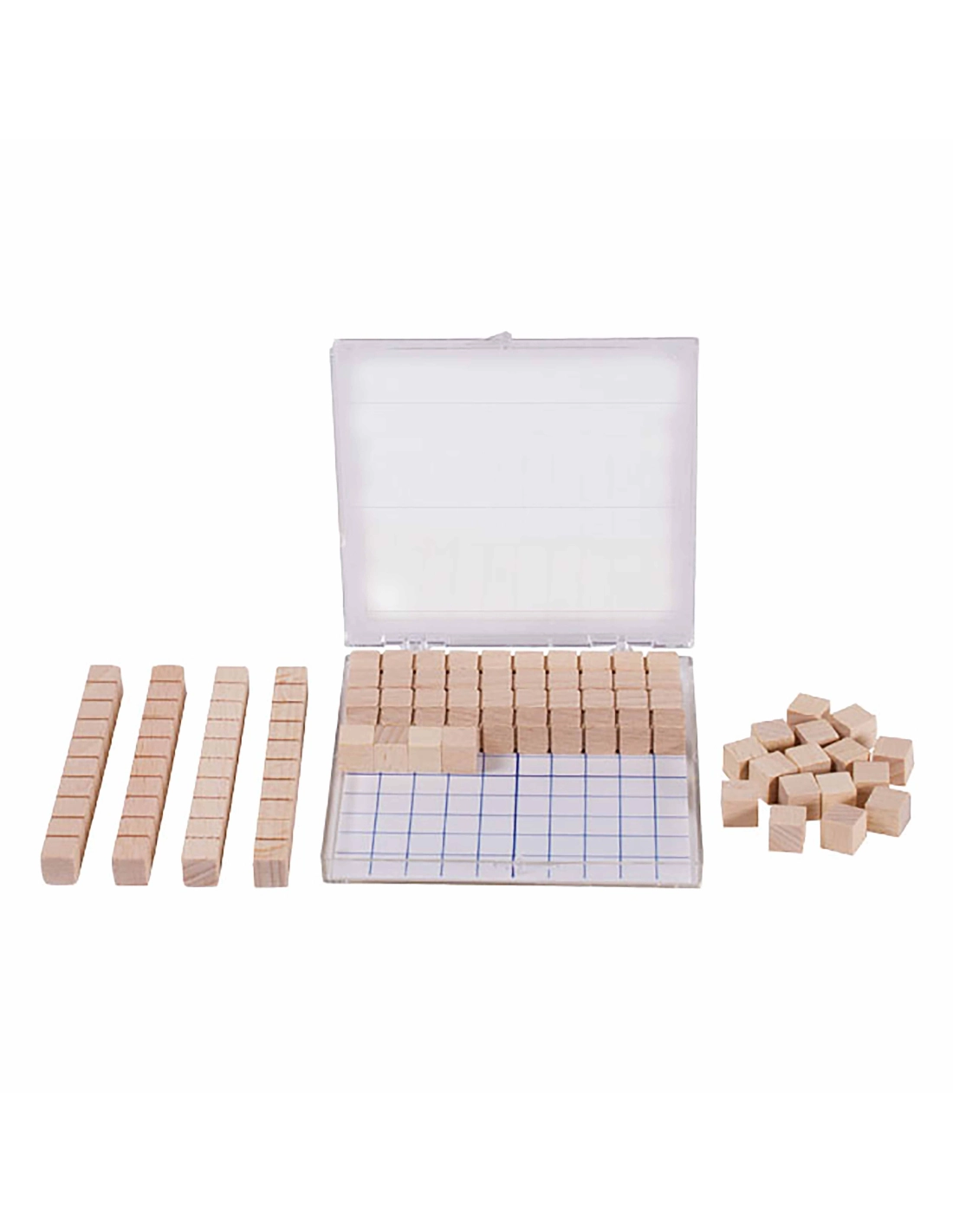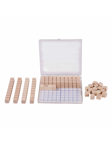 Avec 20 cubes unitaires, 8 bâtons de dizaines, une plaque de centaines imprimée 1-100 en RE-Wood® et une feuille intercalaire grilles dans une boîte en plastique en RE-Plastic®. La boîte est comprise dans le lot.