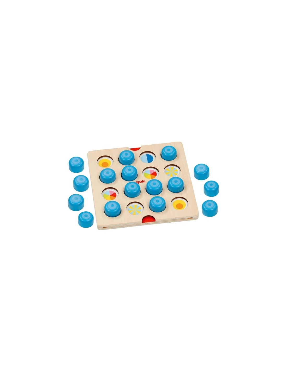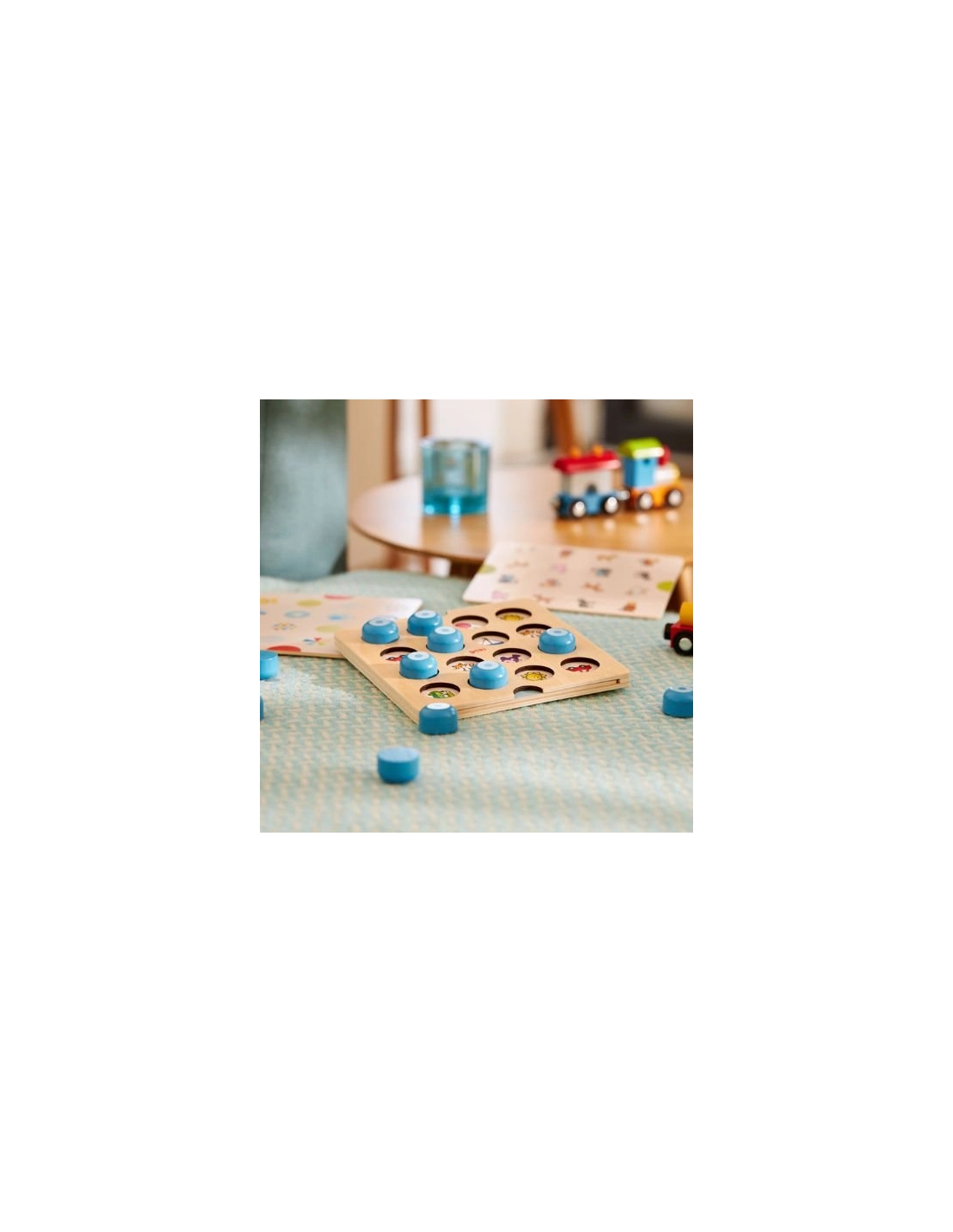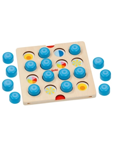 Découvrez une nouvelle façon de jouer au mémo ! Avec ses jolis pions bleus qui cachent des surprises, ce jeu réinvente le classique jeu de mémoire. Les enfants soulèvent les pions pour découvrir les animaux et symboles cachés en dessous, cherchant à retrouver les paires identiques.