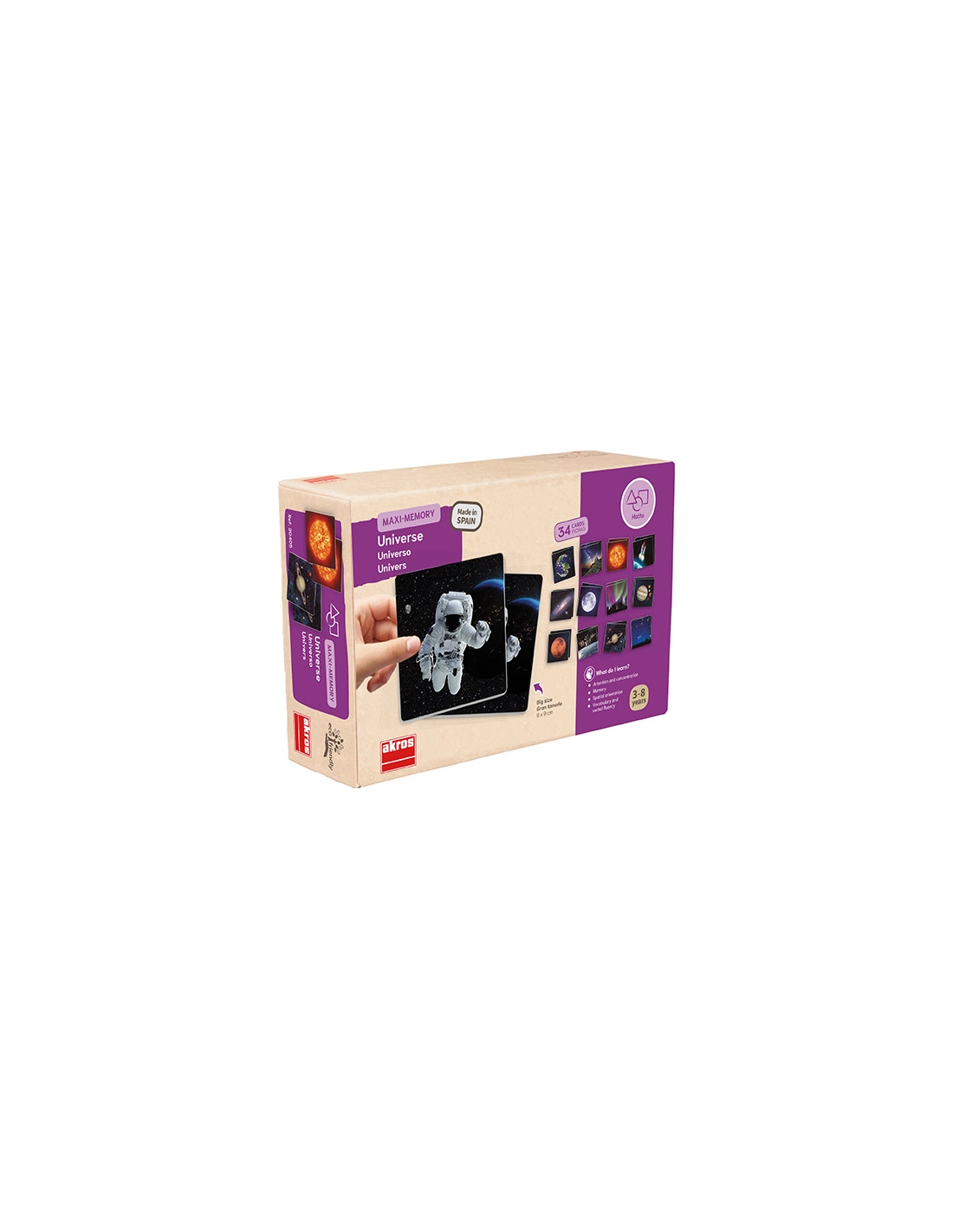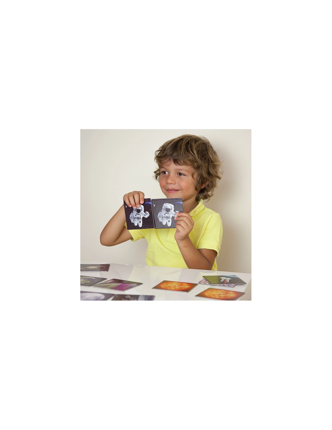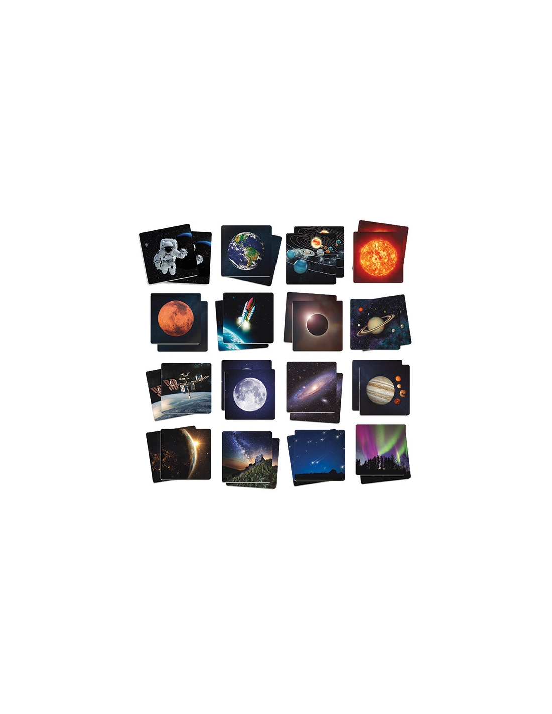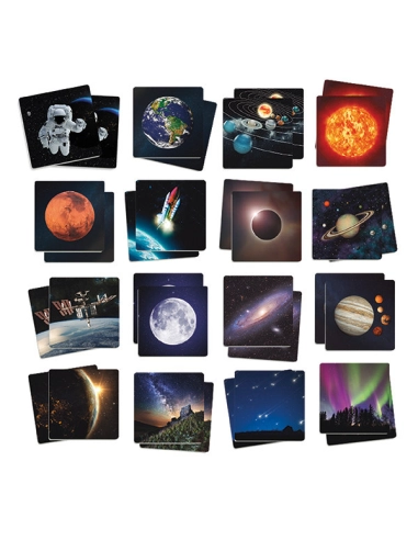 Jeu Memory grand format avec 34 cartes photos réelles des merveilles de l'univers : galaxies, nébuleuses, planètes et phénomènes cosmiques. Ce jeu de mémoire combine découverte scientifique et développement de la concentration dès 3 ans.