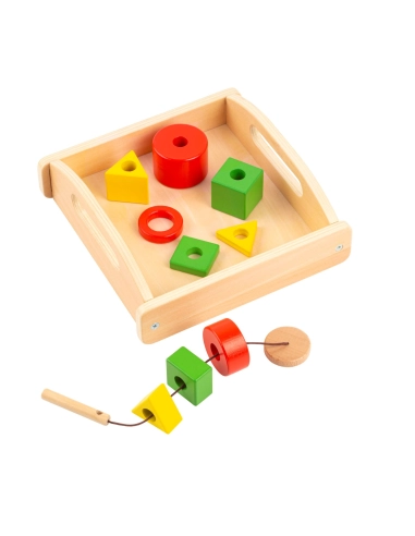 Cette activité comprend des perles en bois de formes, de couleurs et de tailles différentes, un lacet et un plateau de taille enfant pour une installation facile dans n'importe quel espace de jeu.