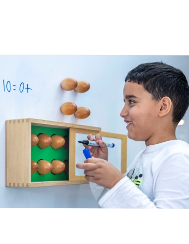 Les Oeufs à compter sont conçus pour rendre l'apprentissage des mathématiques amusant et engageant. Chaque œuf en bois est équipé d'un aimant puissant qui le maintient en place dans la boîte à œufs ou sur toute surface magnétique. La boîte à œufs est également équipée d'une surface de tableau blanc, idéale pour écrire des équations et vérifier les réponses.