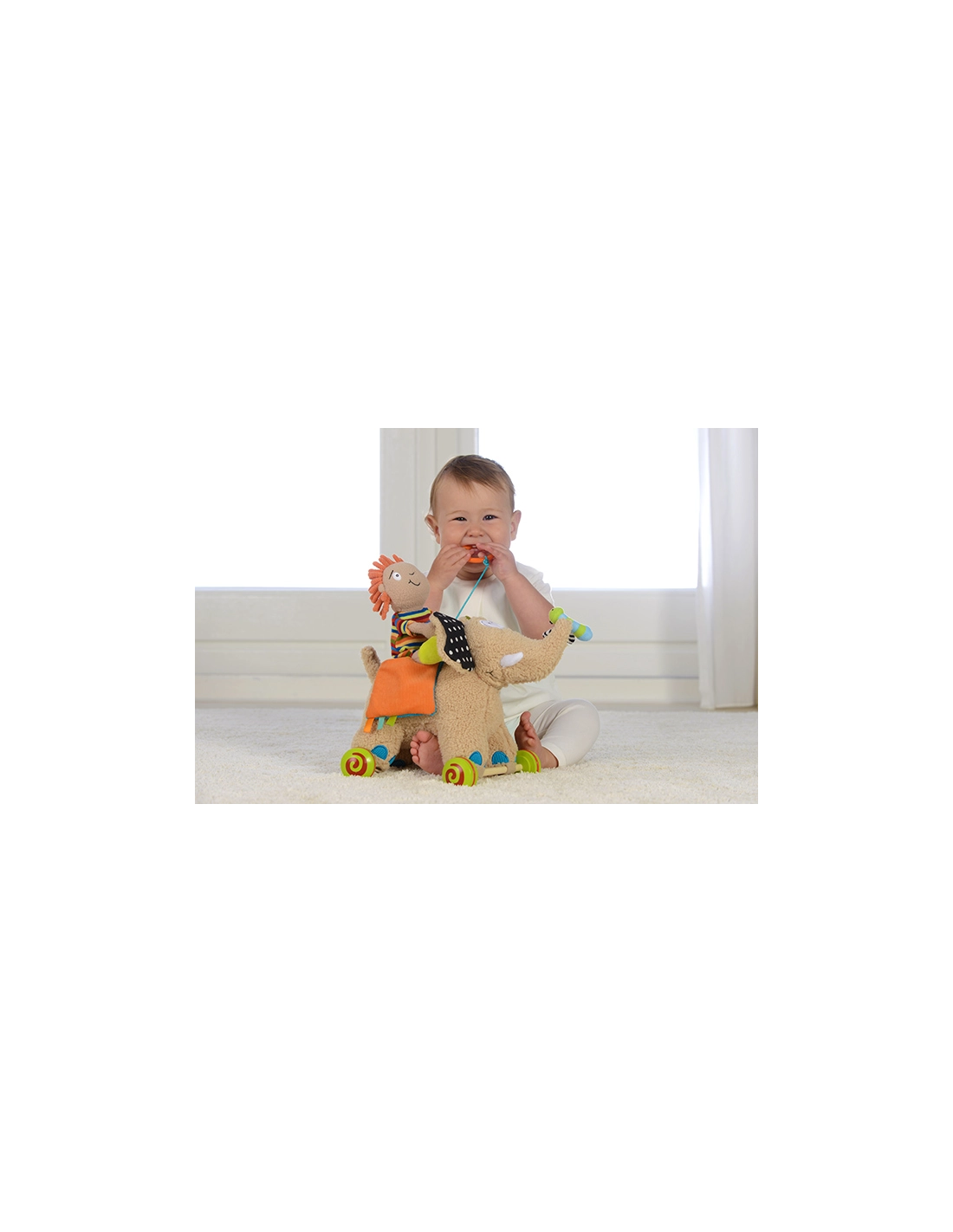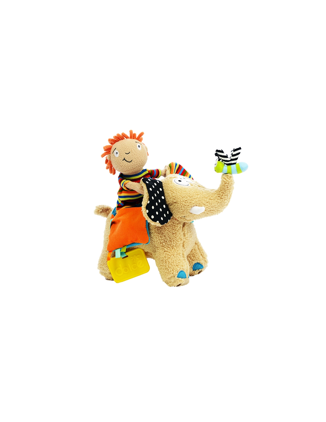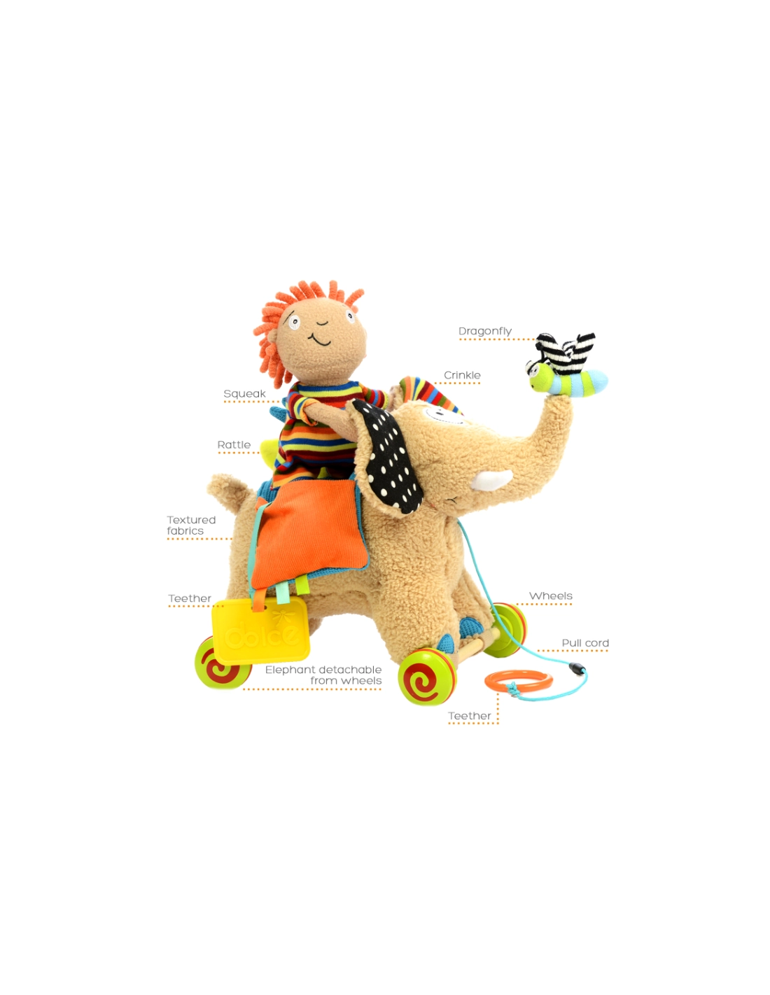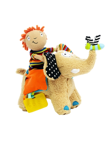 - Multifonctionnel : Comprend un éléphant avec roues amovibles, une poupée détachable, un anneau de dentition, une fleur qui couine, et des éléments bruissants. Semmy offre également des compartiments incluant un hochet, un miroir, un jouet bruissant et un sifflet.