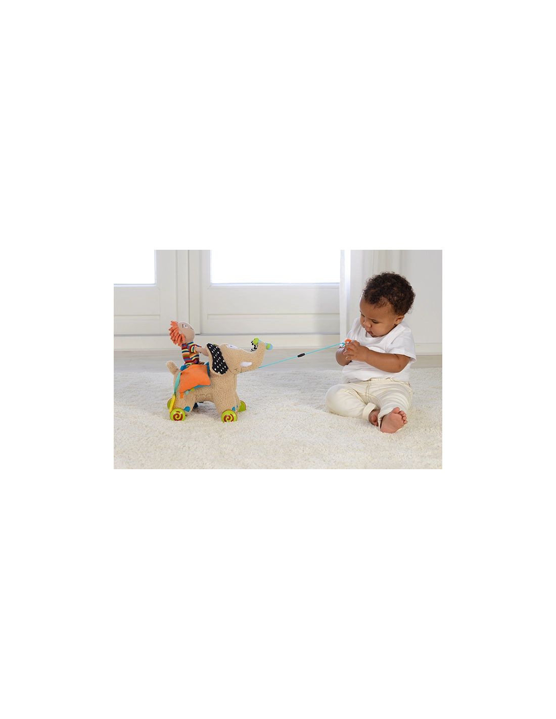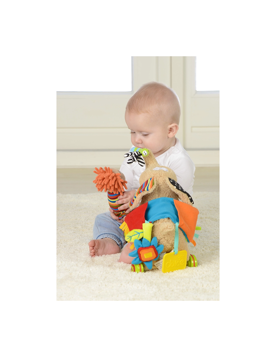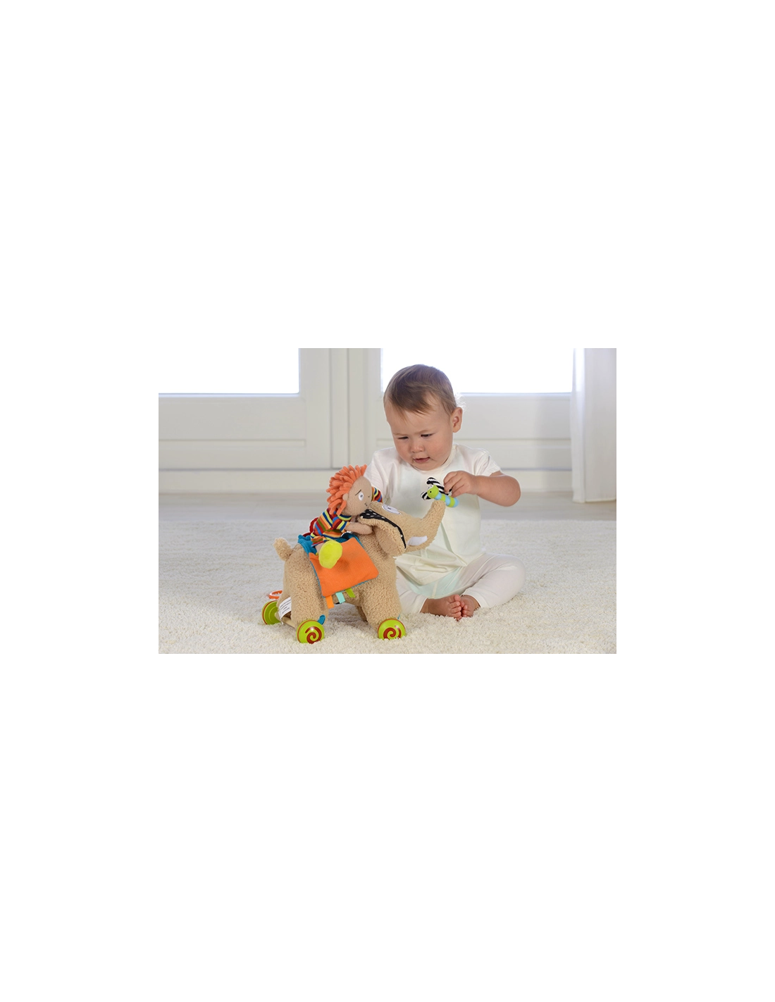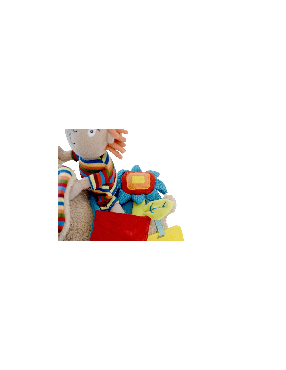 - Multifonctionnel : Comprend un éléphant avec roues amovibles, une poupée détachable, un anneau de dentition, une fleur qui couine, et des éléments bruissants. Semmy offre également des compartiments incluant un hochet, un miroir, un jouet bruissant et un sifflet.