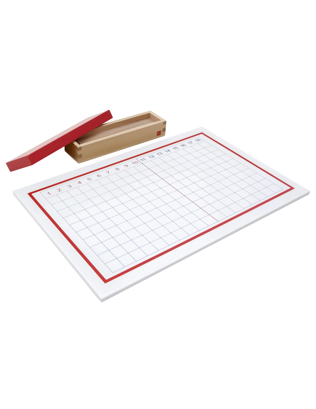 En utilisant le tableau de bord d'addition, l'enfant pratique la séquence de combinaisons d'addition 1-9 et commence le processus de mémorisation des tables d'addition.Le matériau est composé d'un tableau de carbone 12 carrés de 18 carrés avec les nombres 1-18 imprimés en haut. Stocké dans une boîte en bois avec le couvercle sont les bandes utilisées pour l'exercice, 9 bandes rouges divisées en carrés et 9 bandes bleues solides, toutes deux imprimées avec les chiffres 1-9.