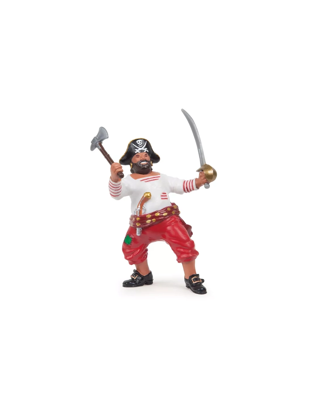 Parmi toutes les figurines de la collection Papo Pirates et Corsaires, le Pirate à la Hache est le seul dont la description mentionne explicitement qu'il ne connaît ni la peur ni la fuite. Pas "courageux" — "sans peur et sans retraite possible". C'est un combattant de choc, pas un stratège. Son rôle dans l'équipage est précis : être le premier à l'abordage, tenir sa position coûte que coûte, et ne jamais reculer quelle que soit la pression adverse. La hache et le sabre dans les deux mains matérialisent cette résolution absolue : il a préparé deux réponses, et aucune n'est la fuite.