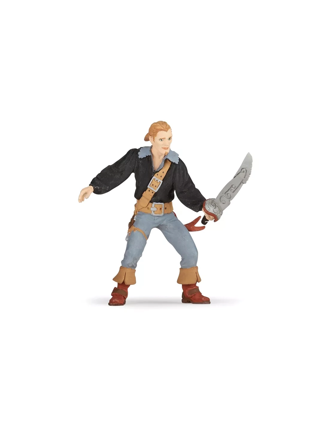 Un sabre. Pas de pistolet, pas de grappin, pas de crochet, pas d'armement multiple. Le Pirate Héros est parti avec ce qu'il avait — une arme et du courage, selon la description Papo. Cette sobriété le distingue de tous les spécialistes de l'équipage et renforce sa qualité d'homme ordinaire dans une situation extraordinaire.