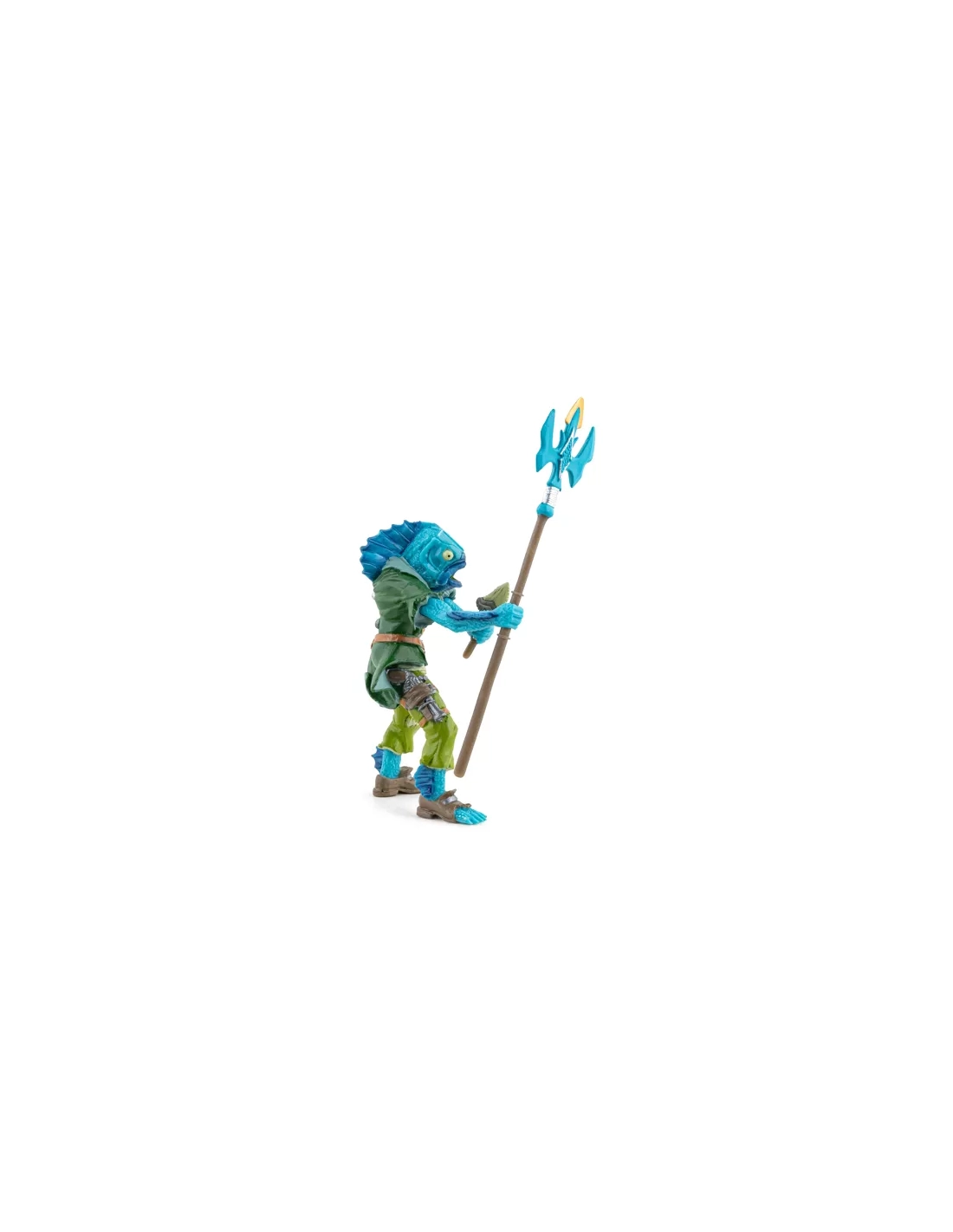 Tête de poisson bleu turquoise aux yeux exorbités et à la gueule ouverte sur des crocs acérés. Corps hybride bleu et vert écailleux, pantalon déchiré vert mousse, courroies de cuir sur les cuisses, chaussures grises usées. Une pieuvre argentée accrochée sur la tête comme un symbole de rang ou une alliance étrange. Trident turquoise à la tête ornementée levé haut dans la main droite, couteau prêt à l'attaque dans la main gauche. Posture en pleine charge, une jambe levée, prêt à sauter sur un pont adverse. Ce pirate mutant sort des profondeurs — et il n'est pas venu pour négocier. Figurine Papo peinte à la main, collection Les Pirates et Corsaires.