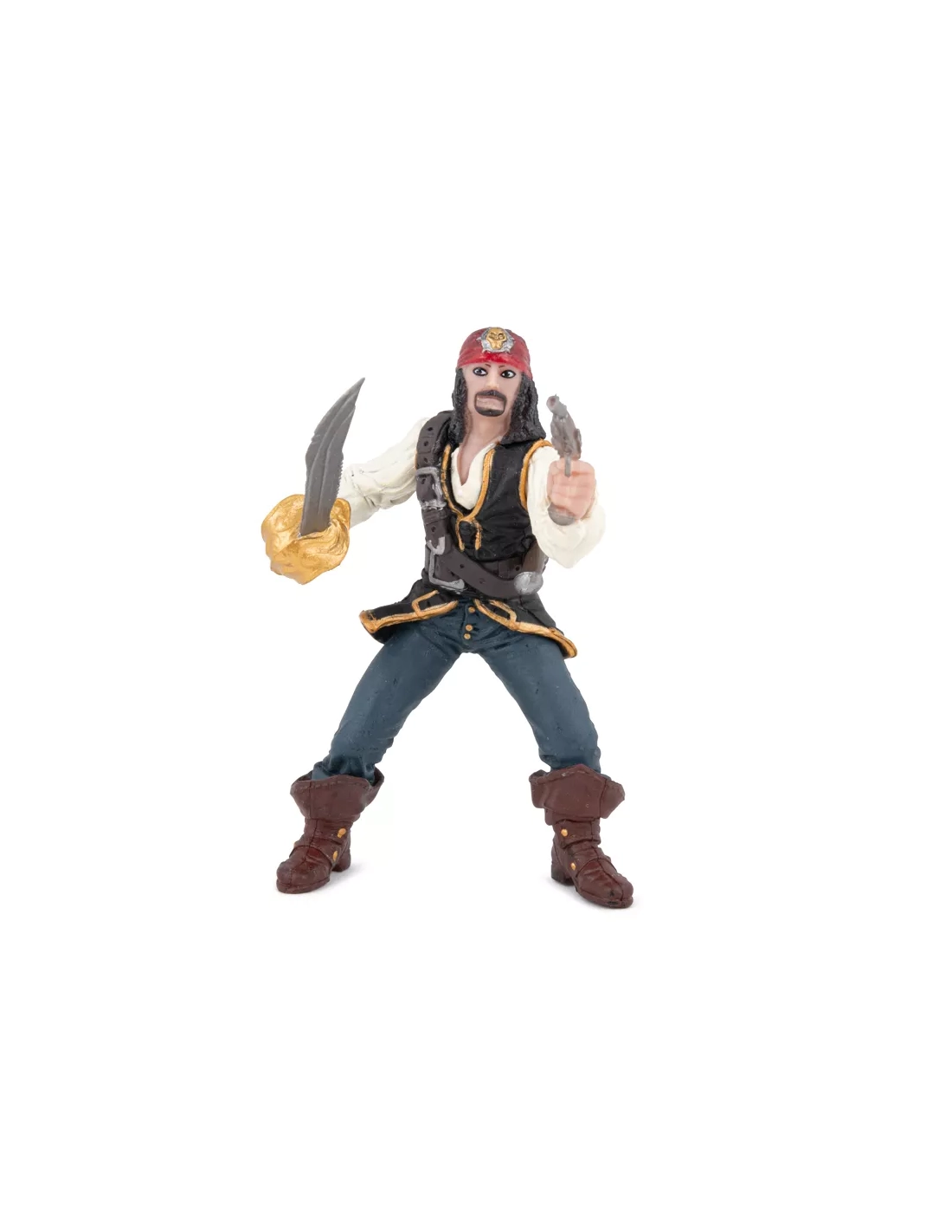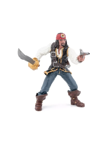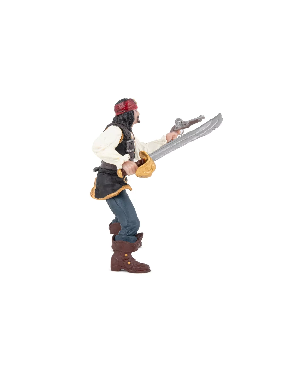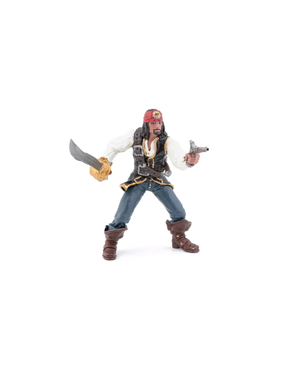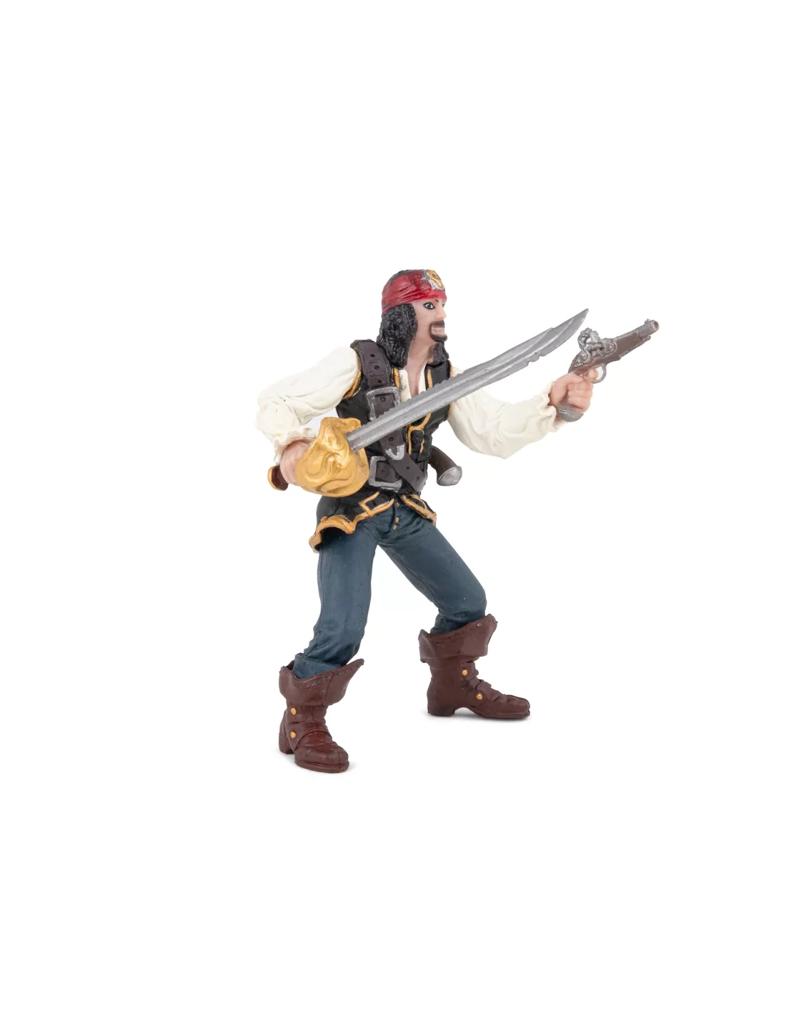 Pirate Papo bandana rouge à tête de mort, pistolet à silex dans la main droite, sabre dans la gauche. Pose de combat double-armes. Peint à la main. 6,8 x 6,2 x 8,6 cm. Nouveauté 2024 de la collection Les Pirates et Corsaires. Dès 3 ans.