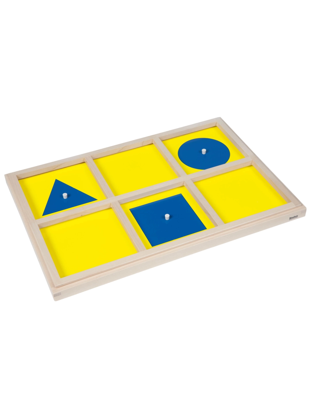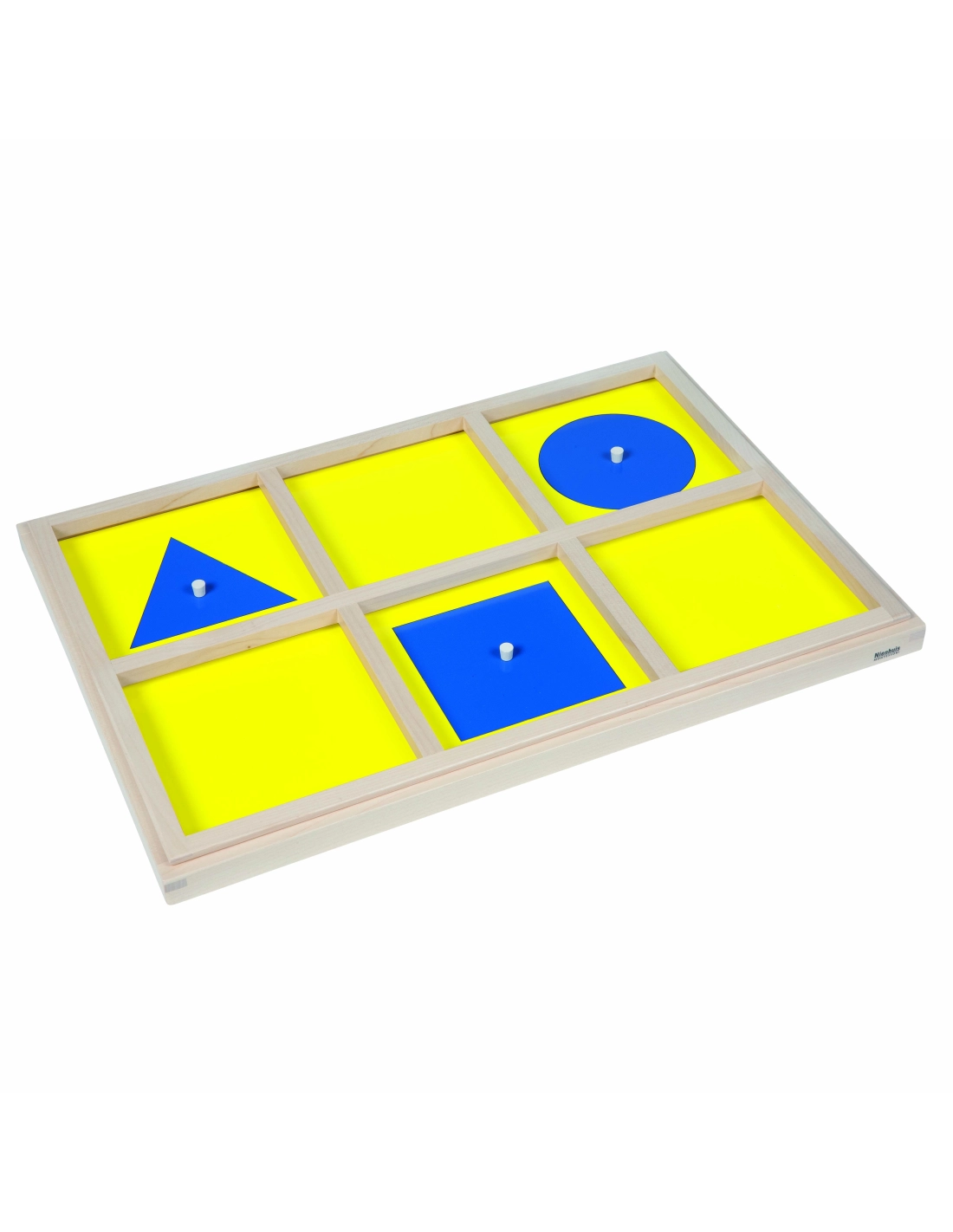 Cet ensemble comprend un tiroir en bois avec trois inserts représentant les figures planes plus simples : un cercle, un triangle équilatéral et un carré. Chaque figure est équipée d'un bouton central et placée dans un cadre carré de couleur jaune, créant un beau contraste avec les figures bleues.