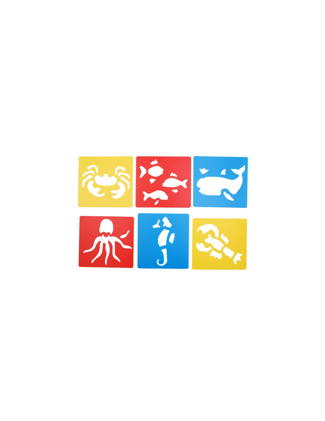 Ce lot de 6 pochoirs en plastique lavables comprend des modèles d'animaux de la mer tels que le poisson, le homard, l'hippocampe, la baleine, la pieuvre et le crabe.