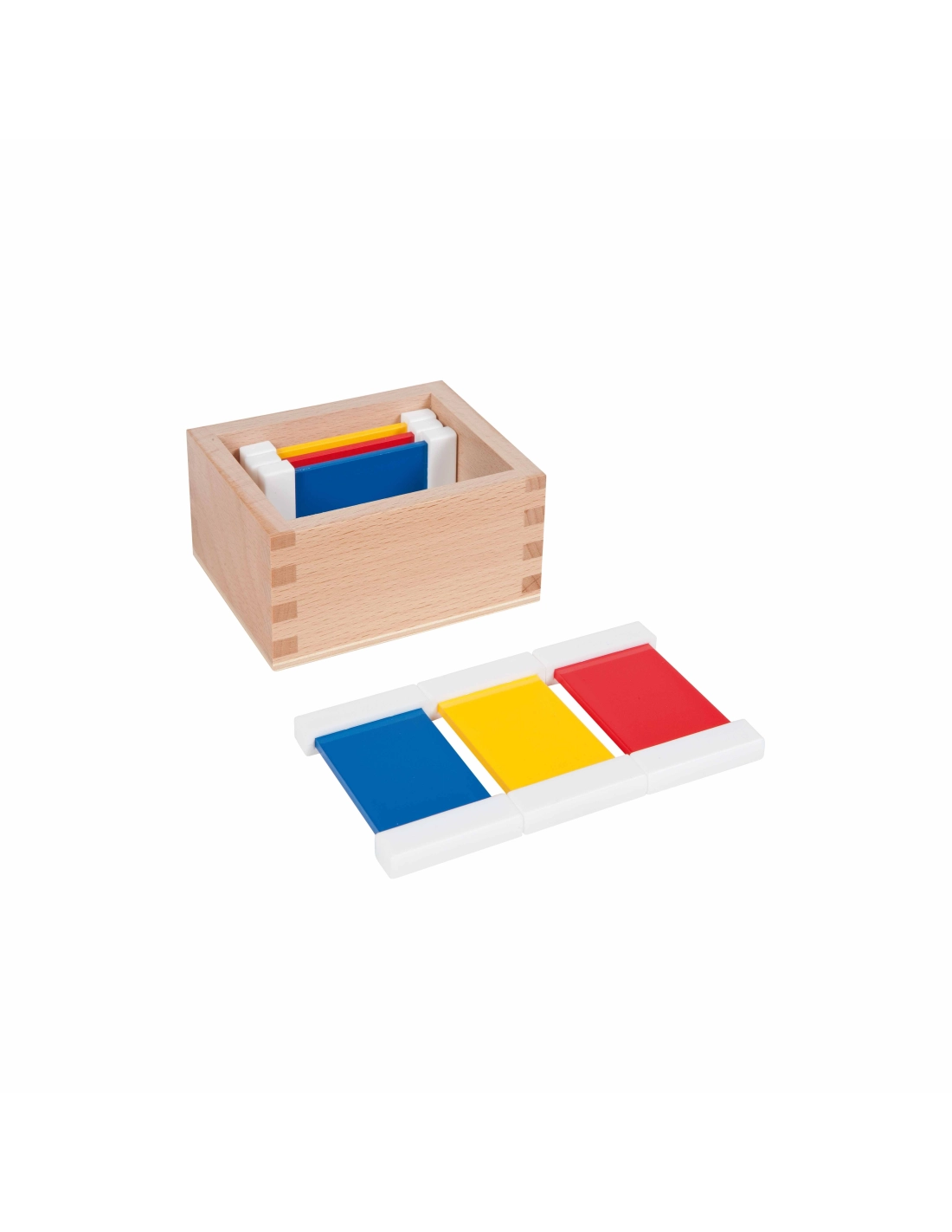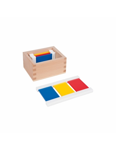 Le matériel sensoriel Montessori isole chaque sens afin qu'il puisse être appréhendé par l'enfant de manière très claire. La première boîte de couleurs permet à l'enfant d'apprendre à discriminer visuellement les couleurs primaires : rouge, jaune et bleu, une base essentielle pour de nombreux apprentissages futurs, notamment en langage et en mathématiques. Ce matériel développe la concentration de l'enfant ainsi que sa motricité fine.