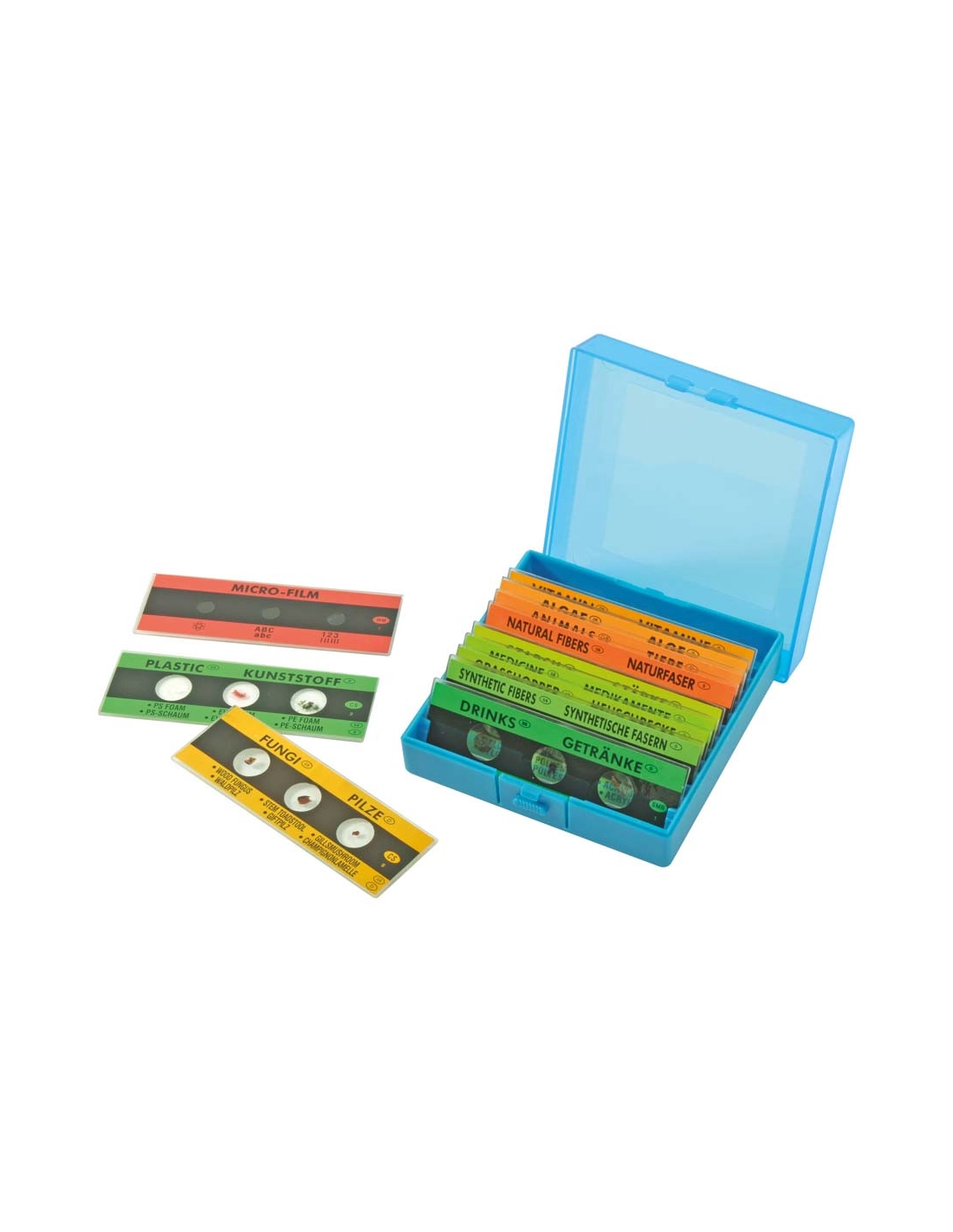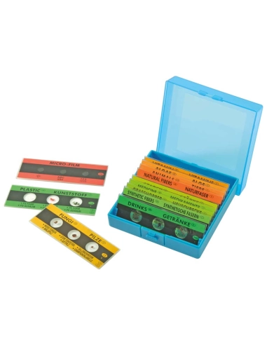 Coupes de microscope déjà prêtes. Les enfants découvrent différents spécimens. Lot 36 préparations variées disposées par 3 sur 12 lamelles (coupes) à utiliser avec un microscope. Les spécimens comprennent une variété comme?; boissons, plastique, fibres synthétiques, sauterelle, amidon, microfilm, fibres naturelles, animales, algues, vitamines et champignons. Le tout dans une boîte de rangement.