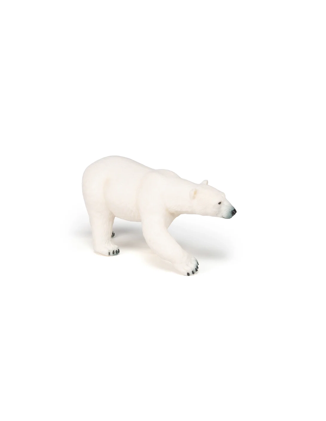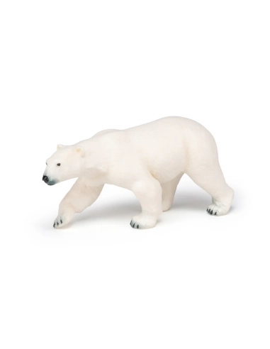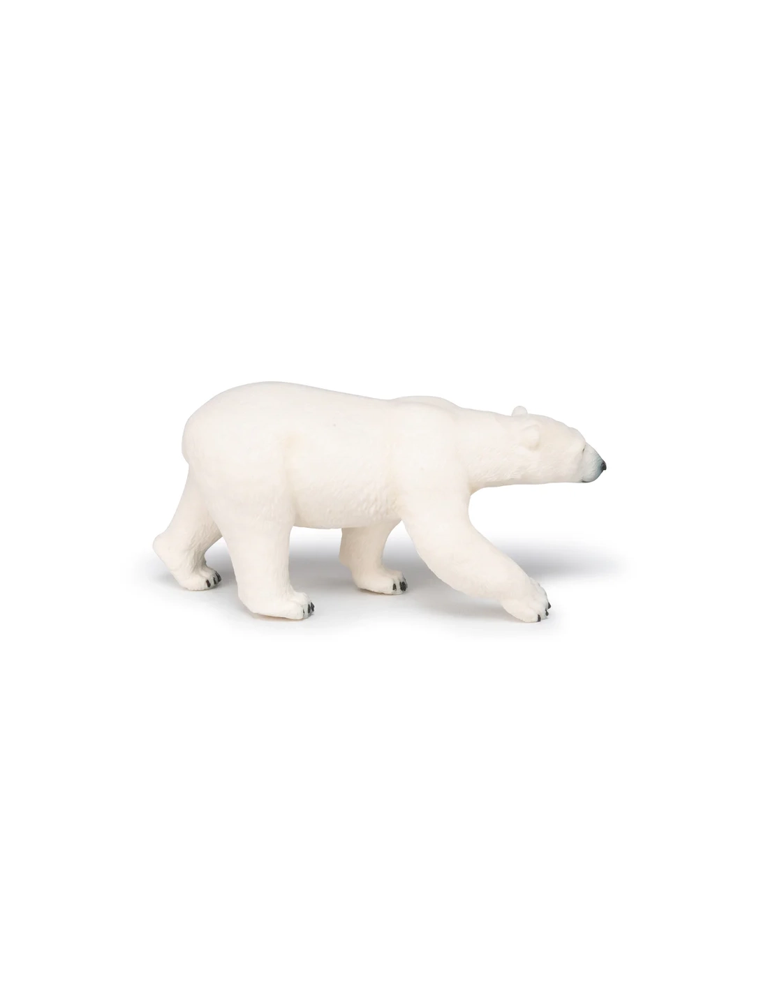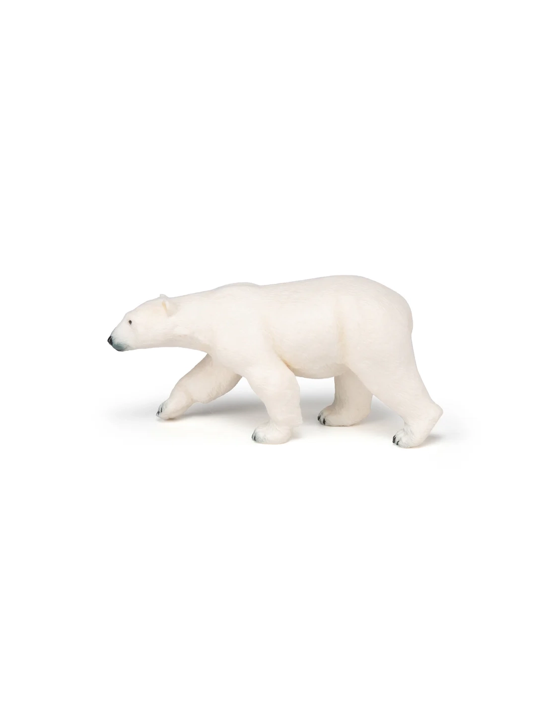 Cette figurine Papo représente l’ours polaire, un grand carnivore parfaitement adapté à la vie dans l’Arctique. Son corps massif, sa fourrure blanche et sa démarche souple rappellent un animal en déplacement sur la banquise ou à la recherche d’un trou de respiration pour chasser les phoques.