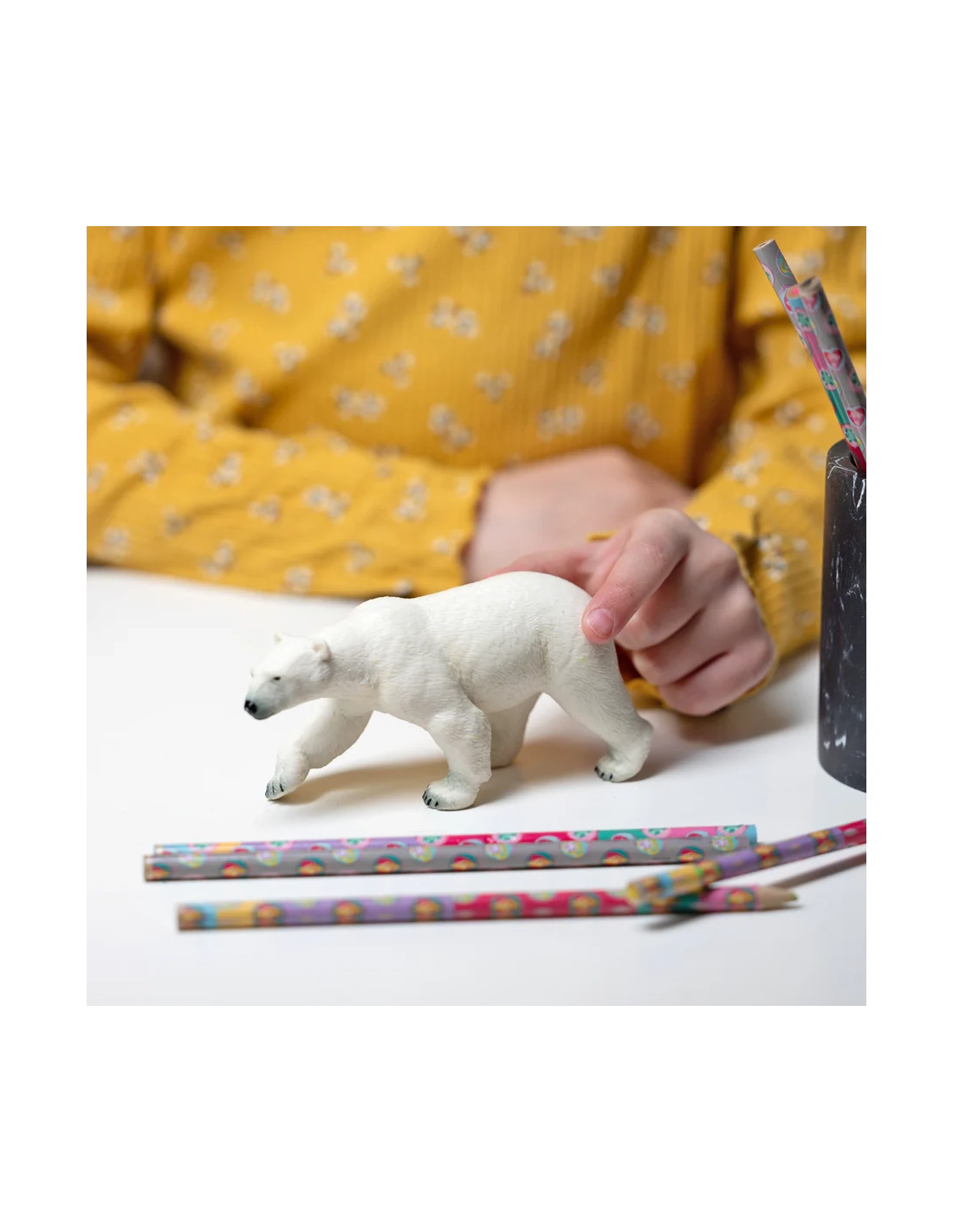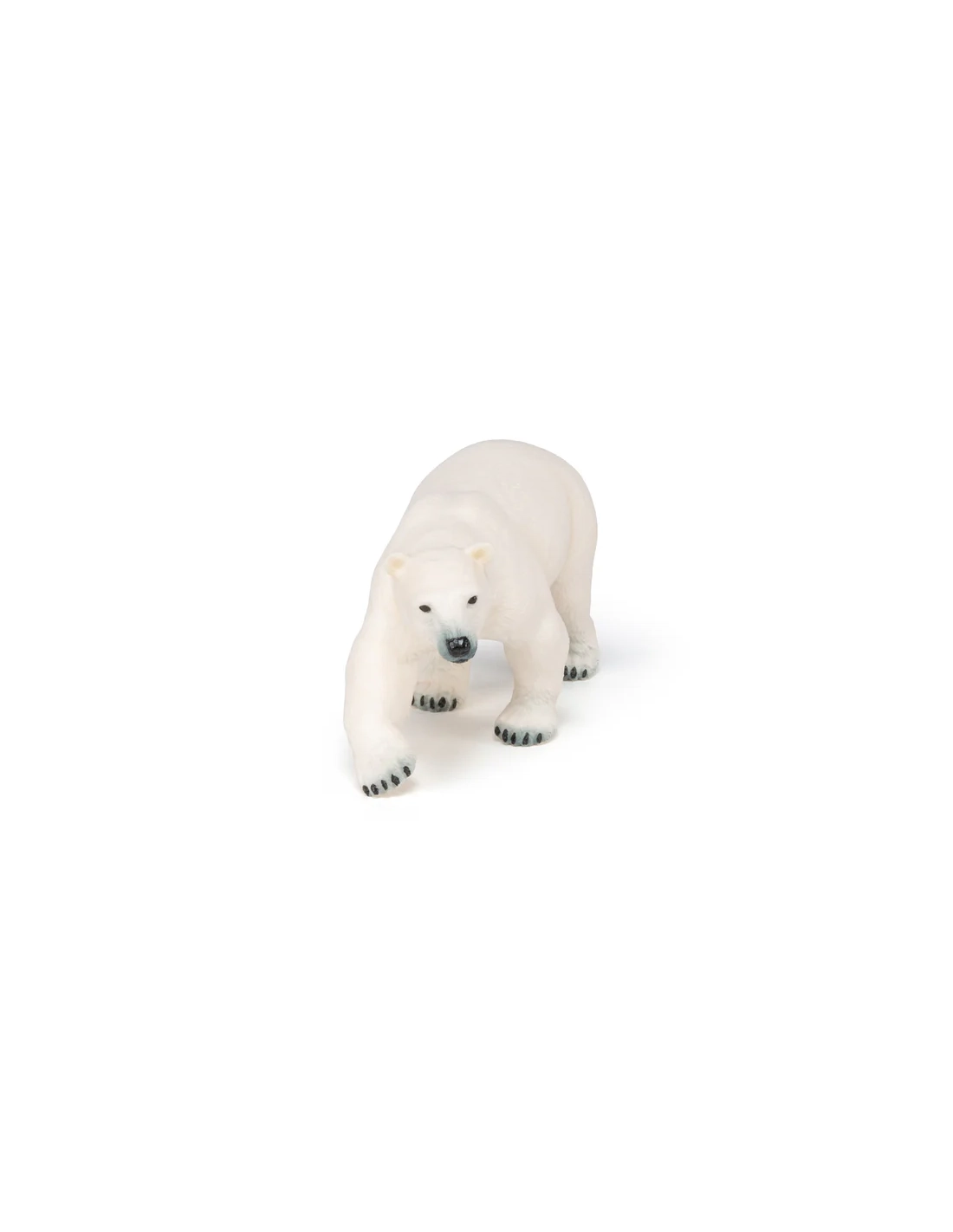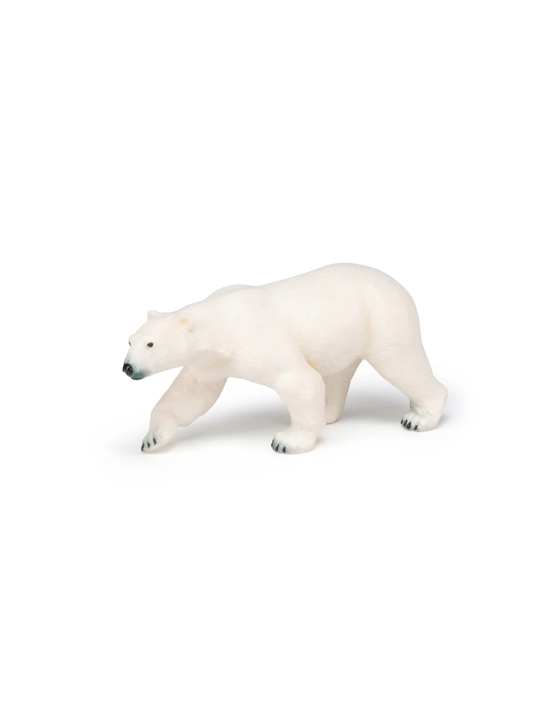 Cette figurine Papo représente l’ours polaire, un grand carnivore parfaitement adapté à la vie dans l’Arctique. Son corps massif, sa fourrure blanche et sa démarche souple rappellent un animal en déplacement sur la banquise ou à la recherche d’un trou de respiration pour chasser les phoques.
