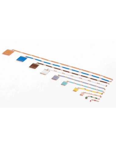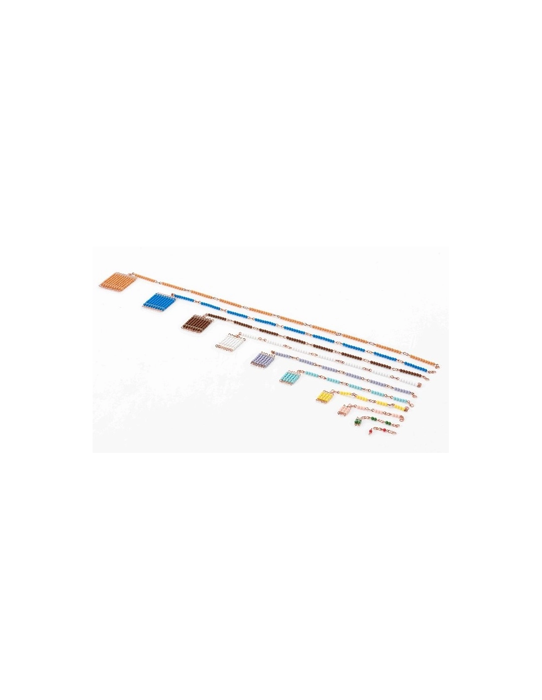 Chaînes de Perles Courtes Connectées, un matériel éducatif essentiel pour l'apprentissage des concepts de comptage linéaire et par sauts, ainsi que de la formation des carrés de nombres selon la méthode Montessori. Conçues pour les enfants en maternelle suivant la méthode Montessori, ces chaînes de perles sont idéales pour introduire les jeunes enfants aux concepts de comptage, de multiples et de carrés de nombres.
