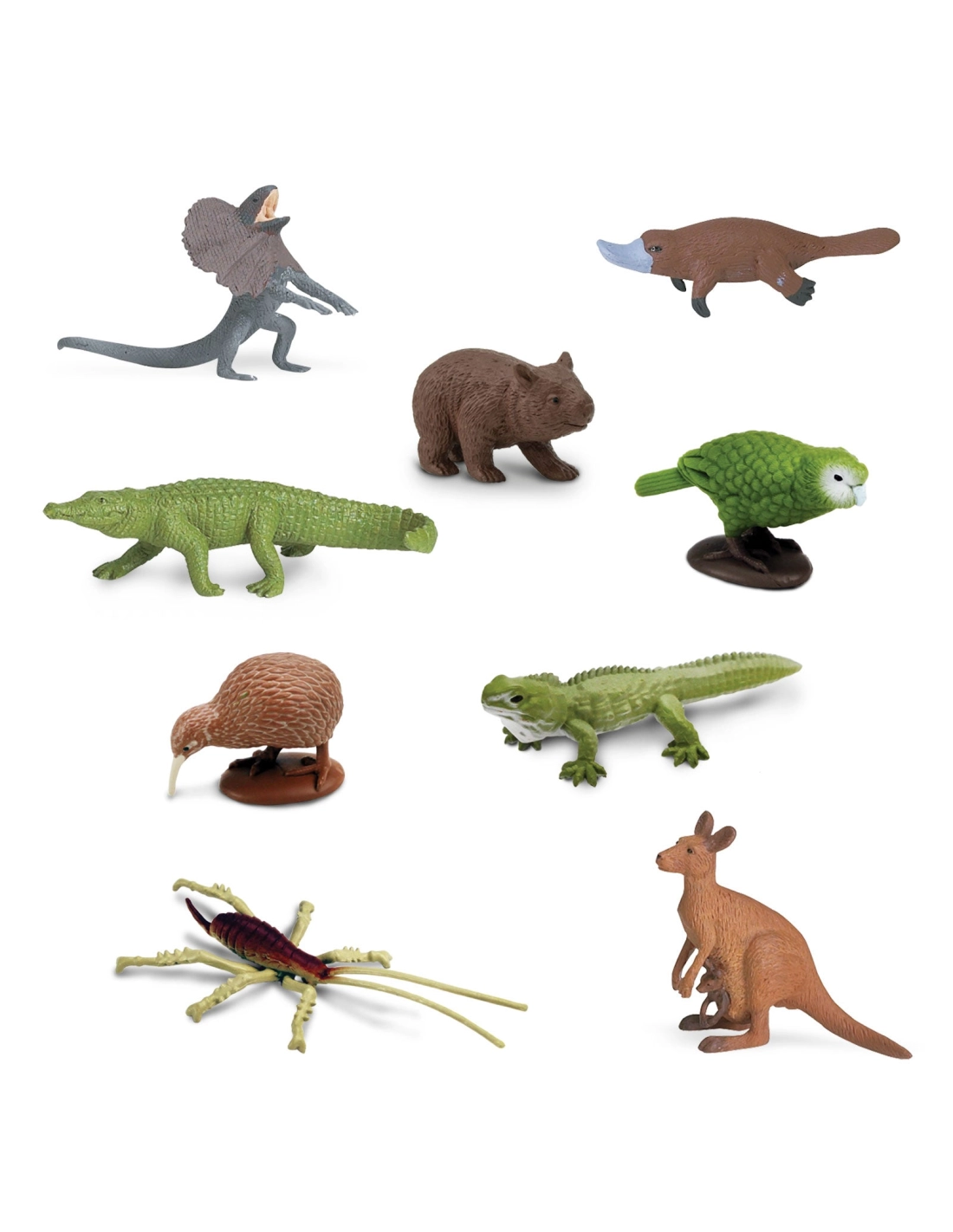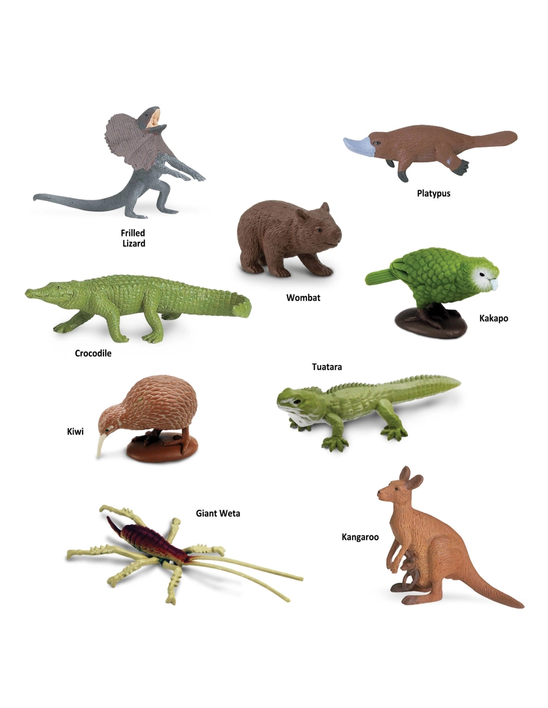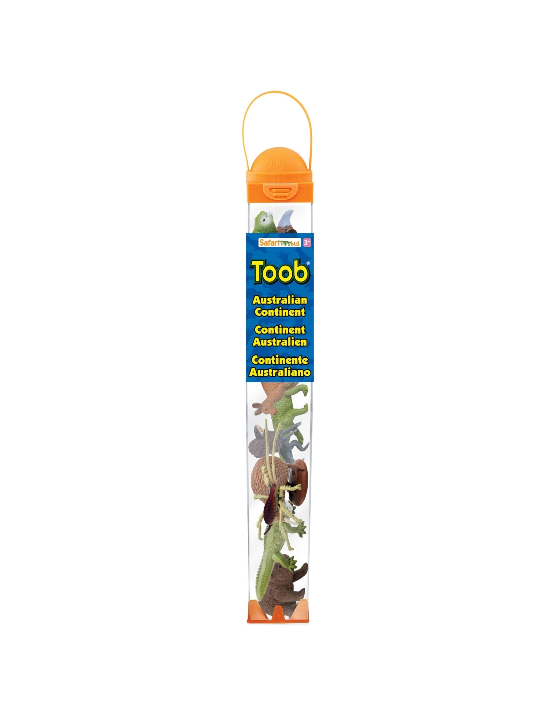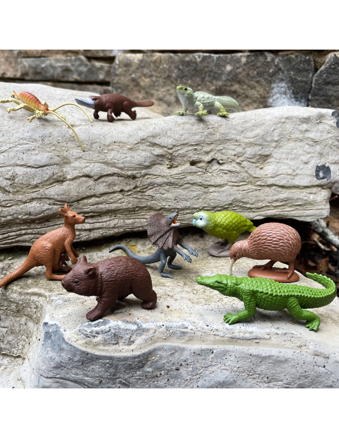 L'ensemble tube "Continent Australien TOOB" de Safari Ltd® contient 9 figurines miniatures mais détaillées, représentant des animaux emblématiques de ces régions, comme un lézard à collerette, un ornithorynque, un wombat, un crocodile, un kakapo, un kiwi, un tuatara, un weta géant, et un kangourou.