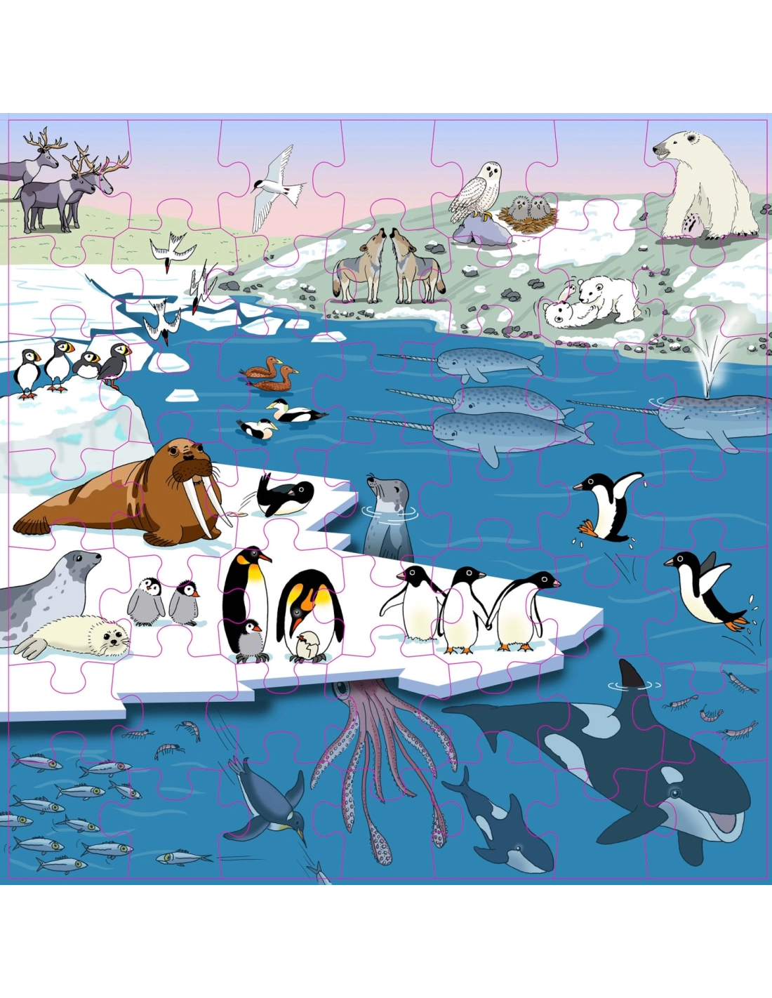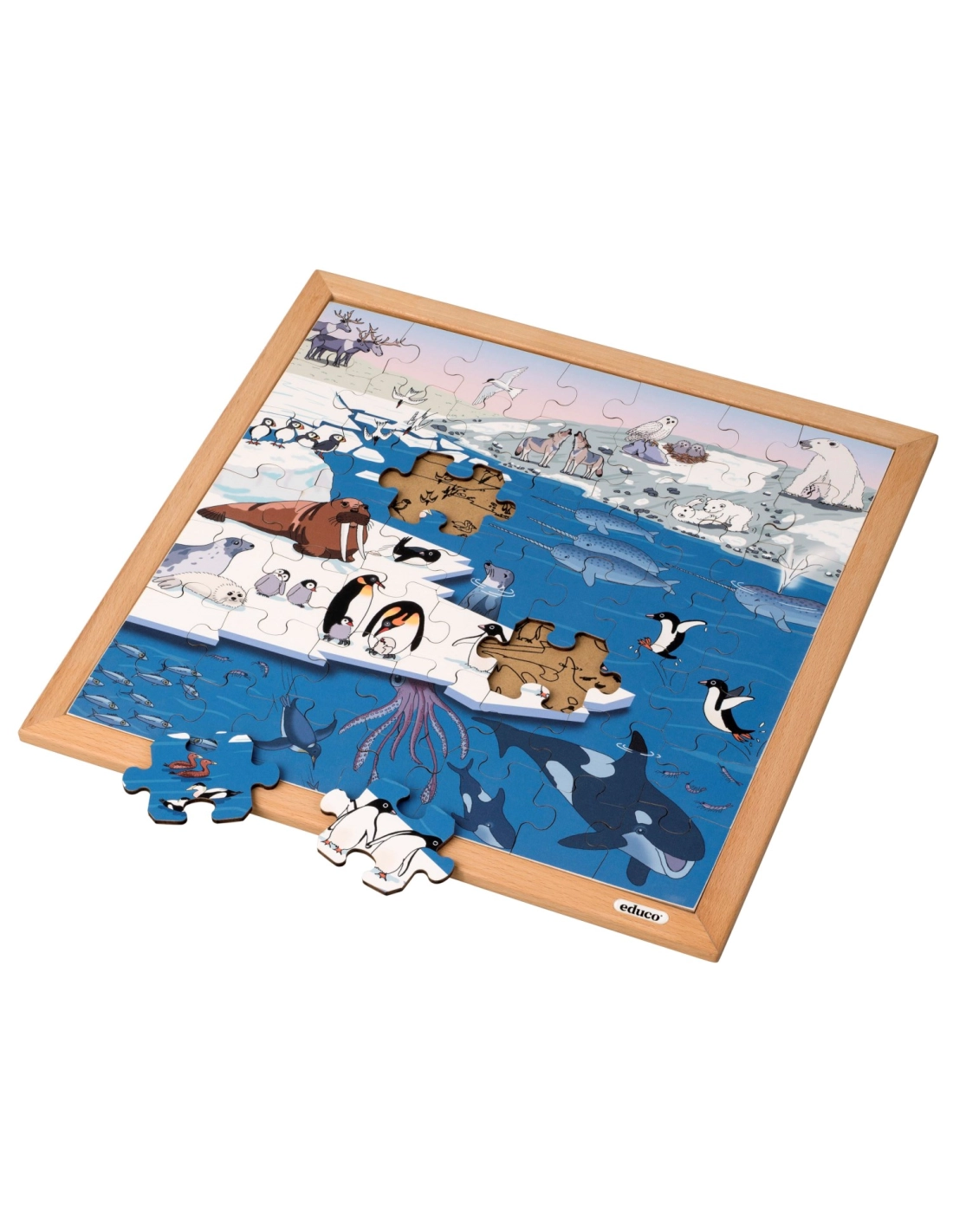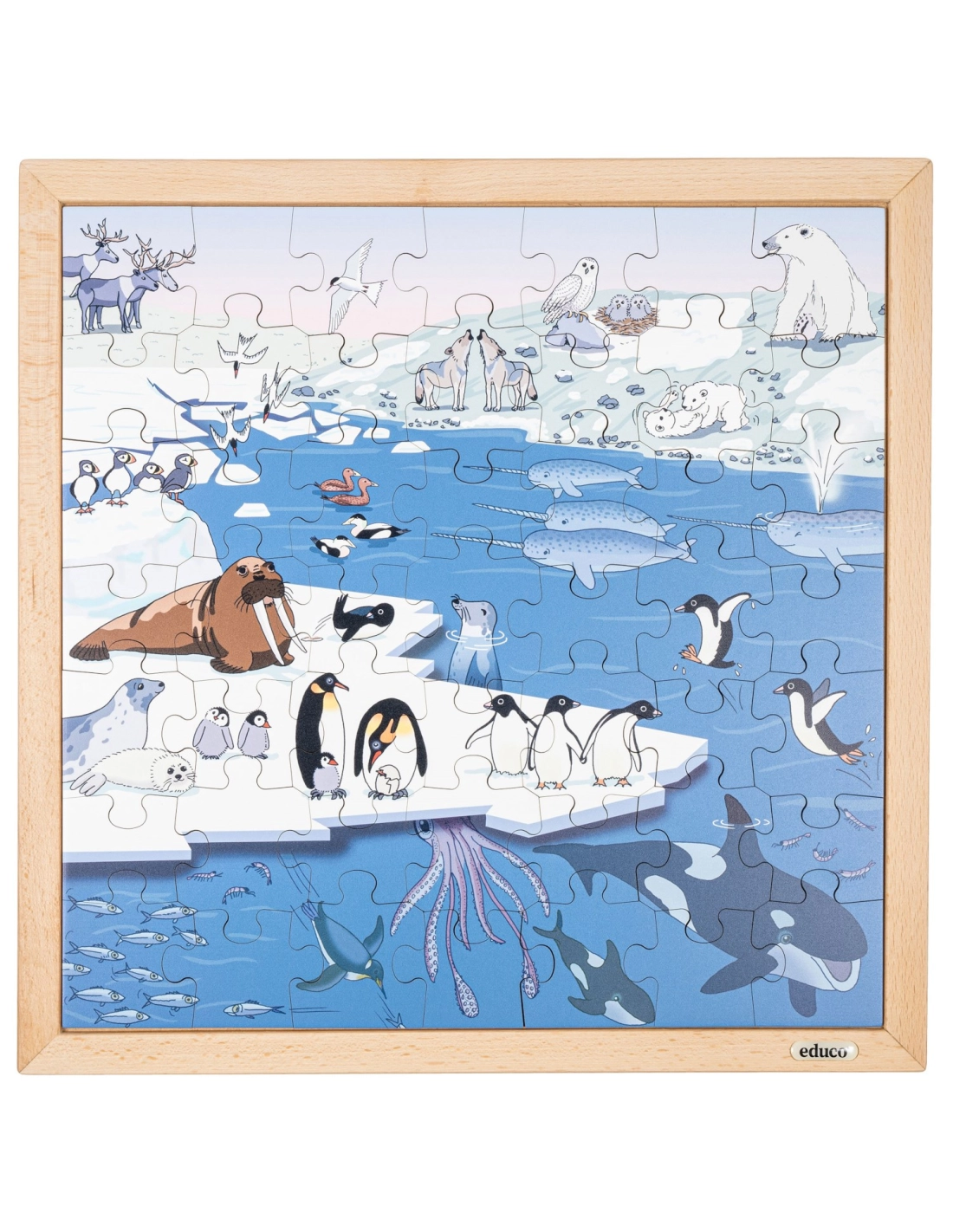 Ce puzzle en bois de 49 pièces aide les enfants à enrichir leur vocabulaire tout en s'amusant. Les grandes pièces contiennent les noms des animaux, permettant d'apprendre naturellement des mots comme "renne", "harfang des neiges" ou "macareux moine". Un excellent support pour développer le langage et la connaissance des animaux à travers le jeu.