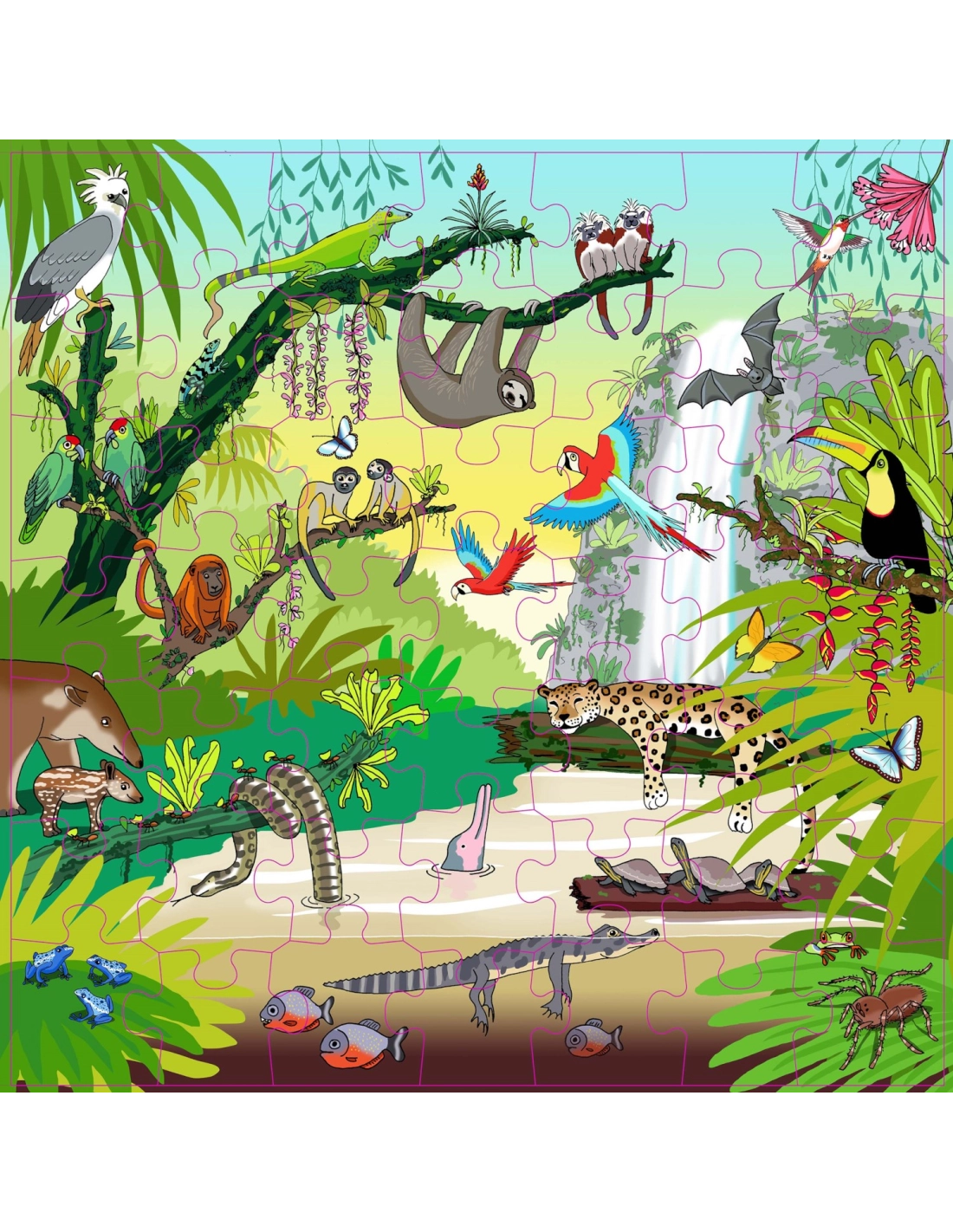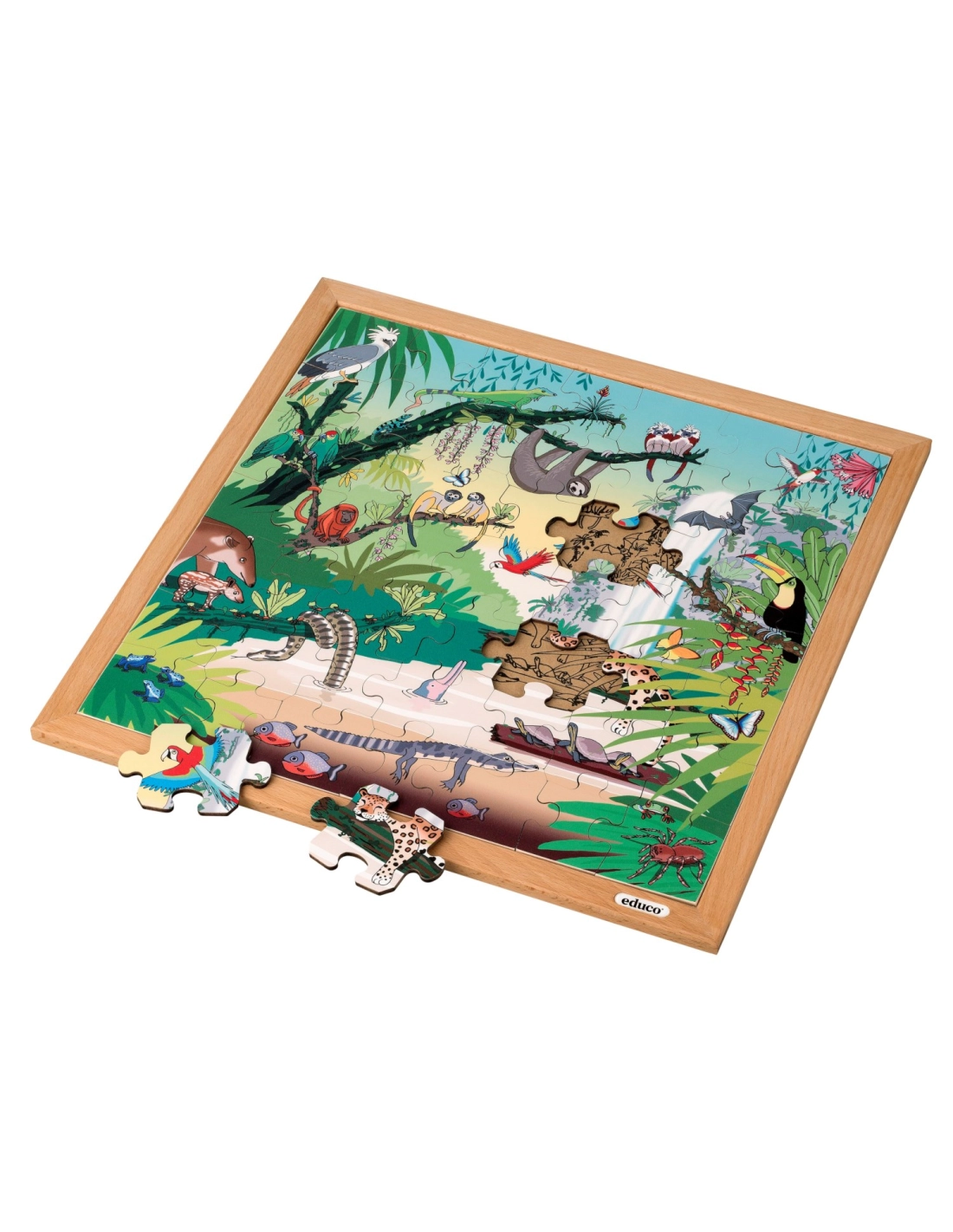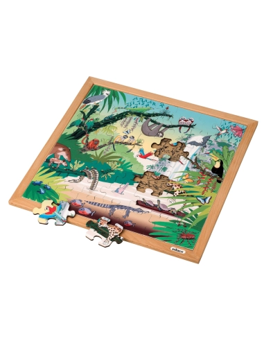 Ce puzzle en bois de 49 pièces emmène les enfants à la découverte de la faune exceptionnelle de la forêt tropicale. Les grandes pièces contiennent les noms des animaux, permettant d'enrichir naturellement le vocabulaire des plus jeunes. Du jaguar majestueux au minuscule colibri, en passant par le paresseux et le toucan, chaque animal raconte une histoire fascinante de la jungle.