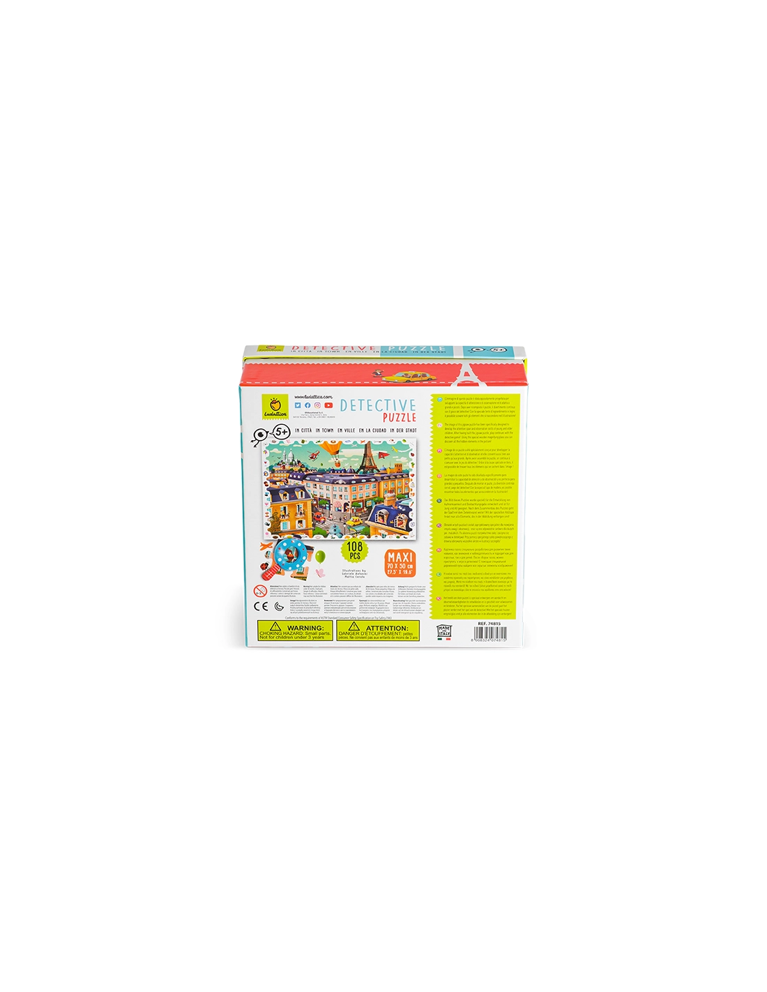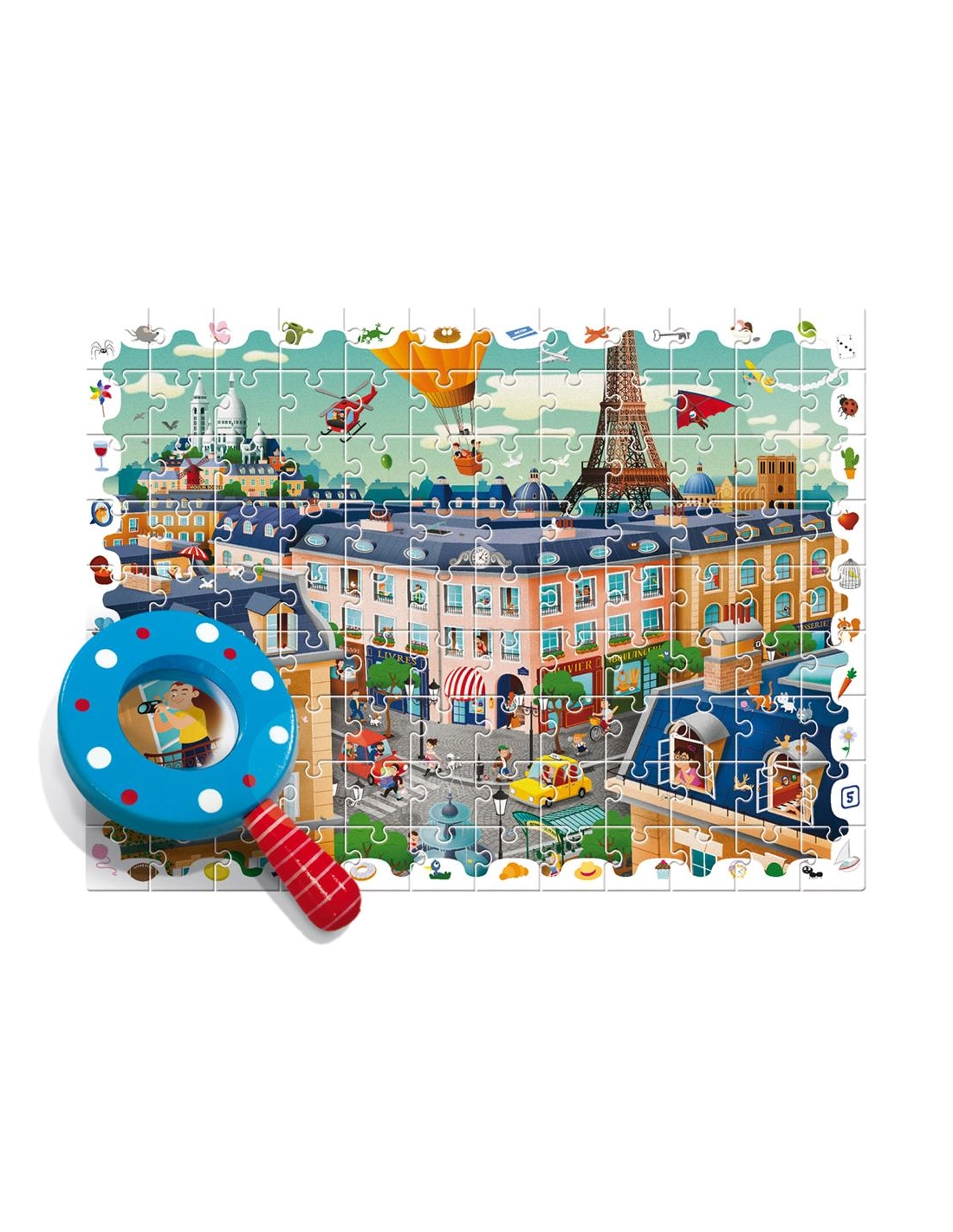 Un concept innovant 2-en-1 : d'abord un puzzle de 108 pièces à assembler, puis une aventure d'observation avec la loupe en bois incluse pour découvrir tous les objets cachés dans l'illustration urbaine. Développe attention, mémoire et capacités d'observation chez les enfants dès 5 ans.