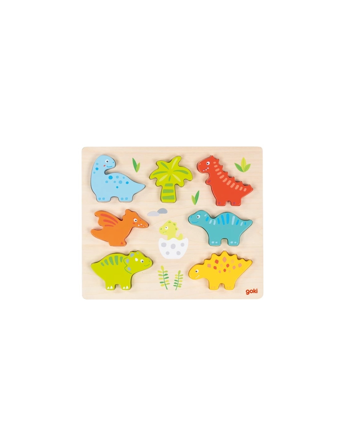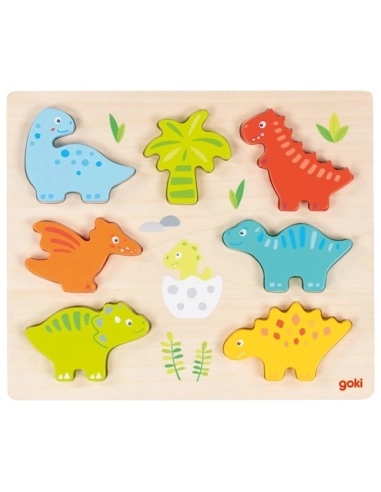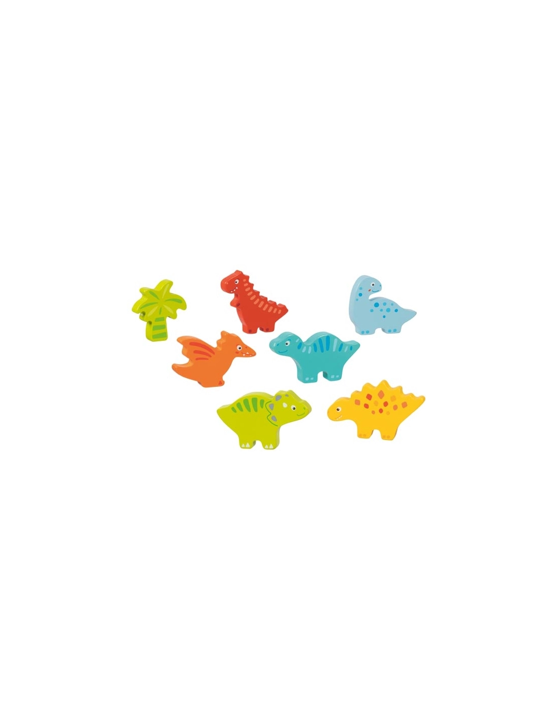 Chaque dinosaure arbore des couleurs vives et un design craquant qui plaît aux tout-petits. Les pièces de 1,5 cm d'épaisseur offrent une prise parfaite pour les petites mains et résistent aux jeux les plus mouvementés. Palmier, plantes et œuf complètent cet univers préhistorique attendrissant.