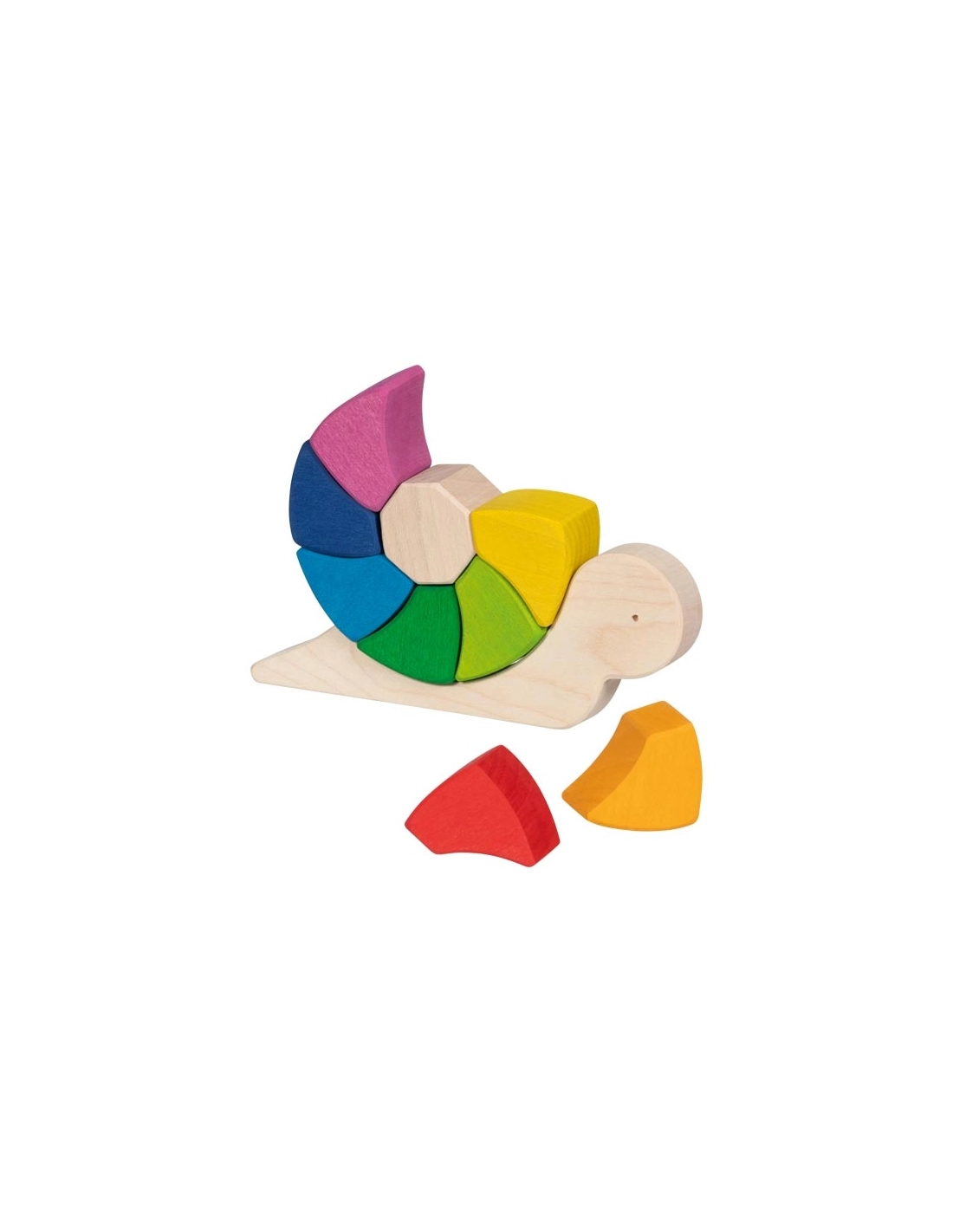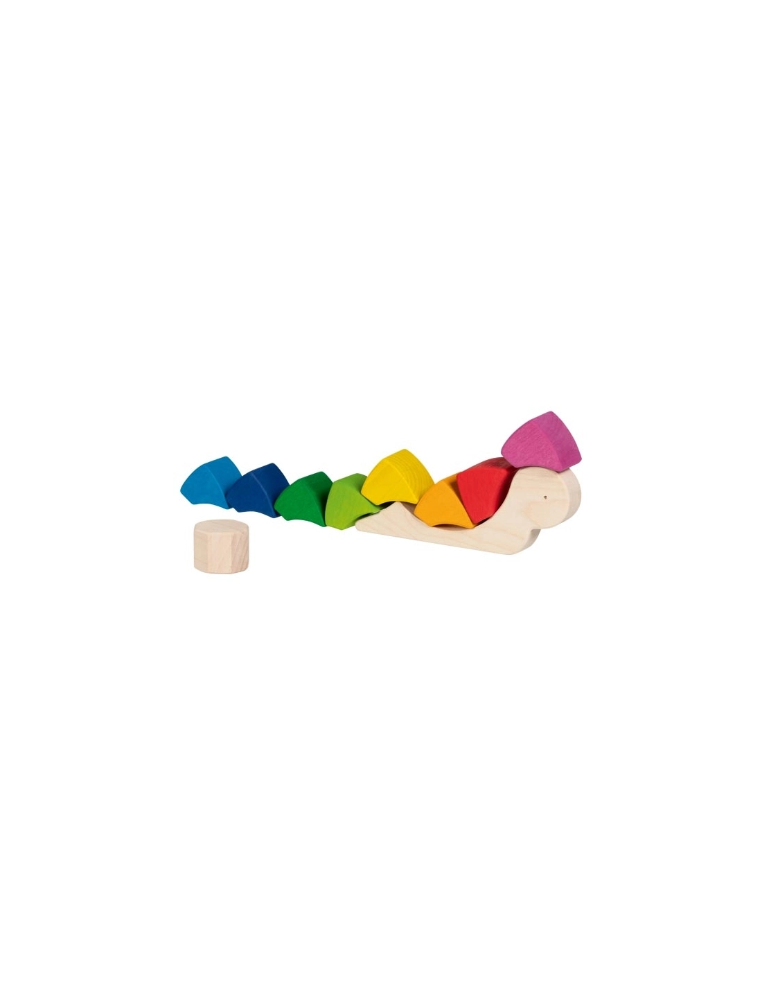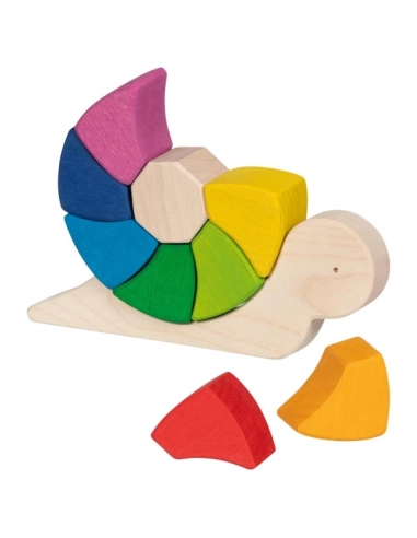 Le puzzle et jeu de construction Escargot Pauline de Goki Evolution est un jouet en bois composé de 10 pièces, dont la carapace se compose de neuf blocs aux douces couleurs de l'arc-en-ciel. Les enfants dès 3 ans peuvent assembler, empiler et manipuler ces blocs de manière créative, tout en profitant de la texture agréable apportée par la lasure.